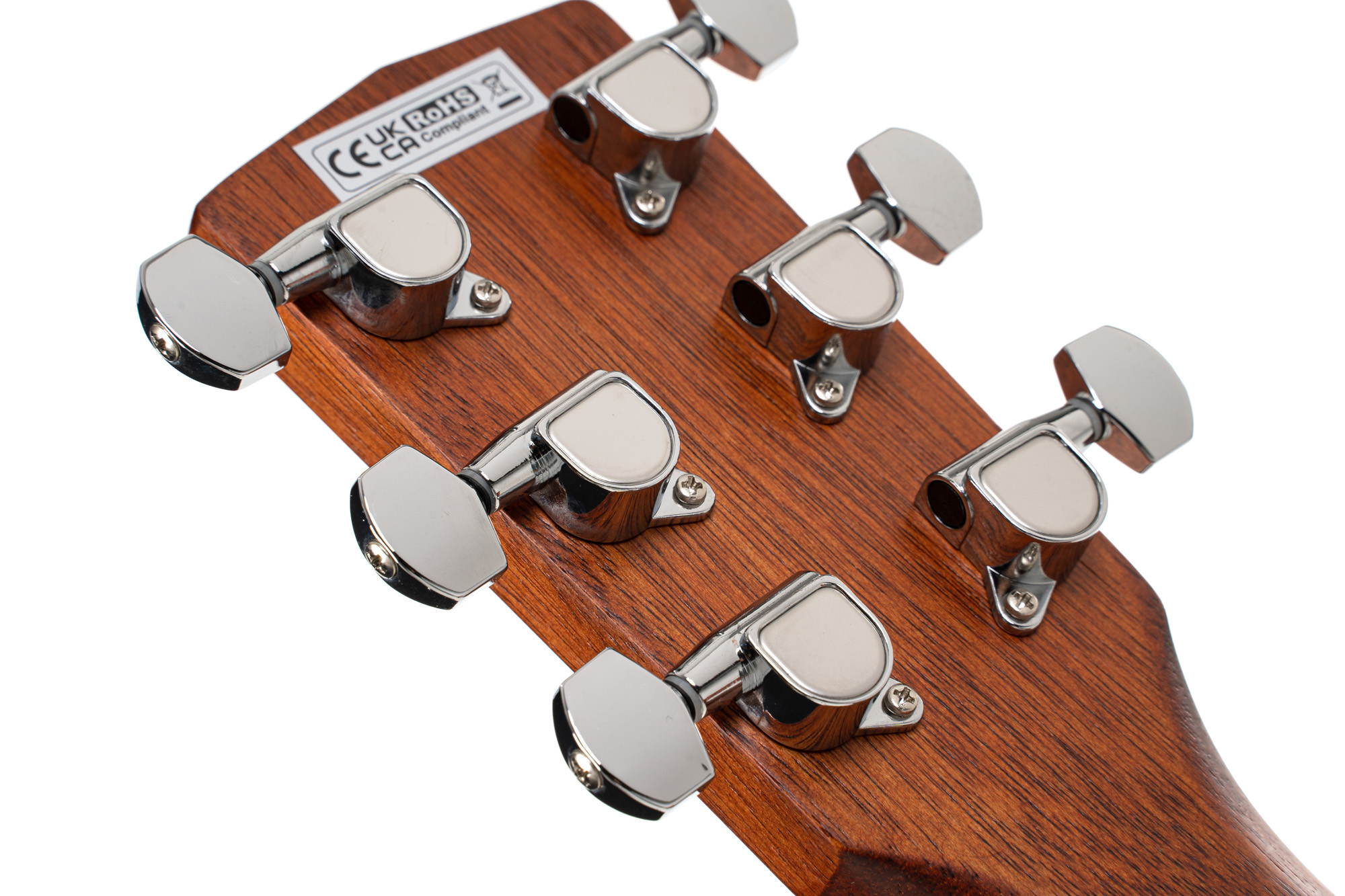 Its mahogany construction for the top, back, and sides, combined with a merbau fingerboard and bridge, offers a coherent and well-finished specification sheet. The pearl-white rosette and the supplied gig bag also add a pleasing finish.