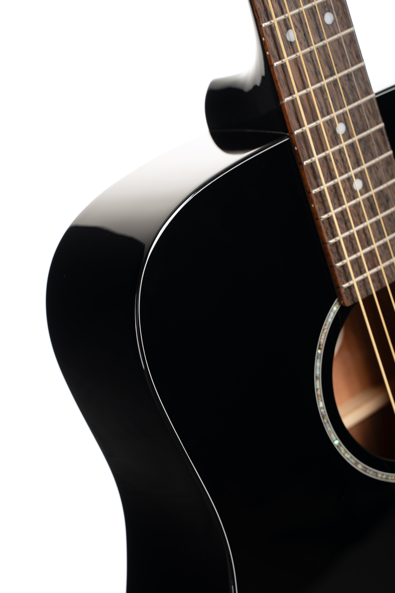 This acoustic guitar stands out for its careful design and elegant look in a glossy black finish. It is equipped with a solid spruce top, combined with mahogany back and sides, for a classic and reliable construction. The laurel fingerboard and mahogany neck complete an instrument designed to offer a comfortable grip and a harmonious sound.