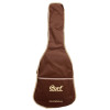 It offers a solid spruce top and an open-pore finish, with useful accessories included: gig bag, tuner, strap, and picks.