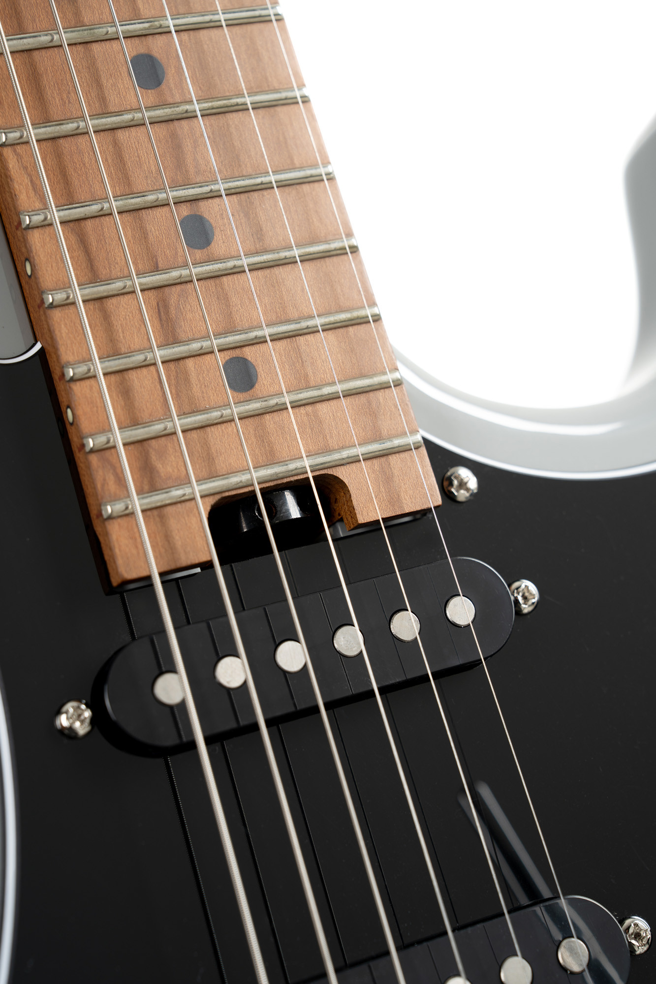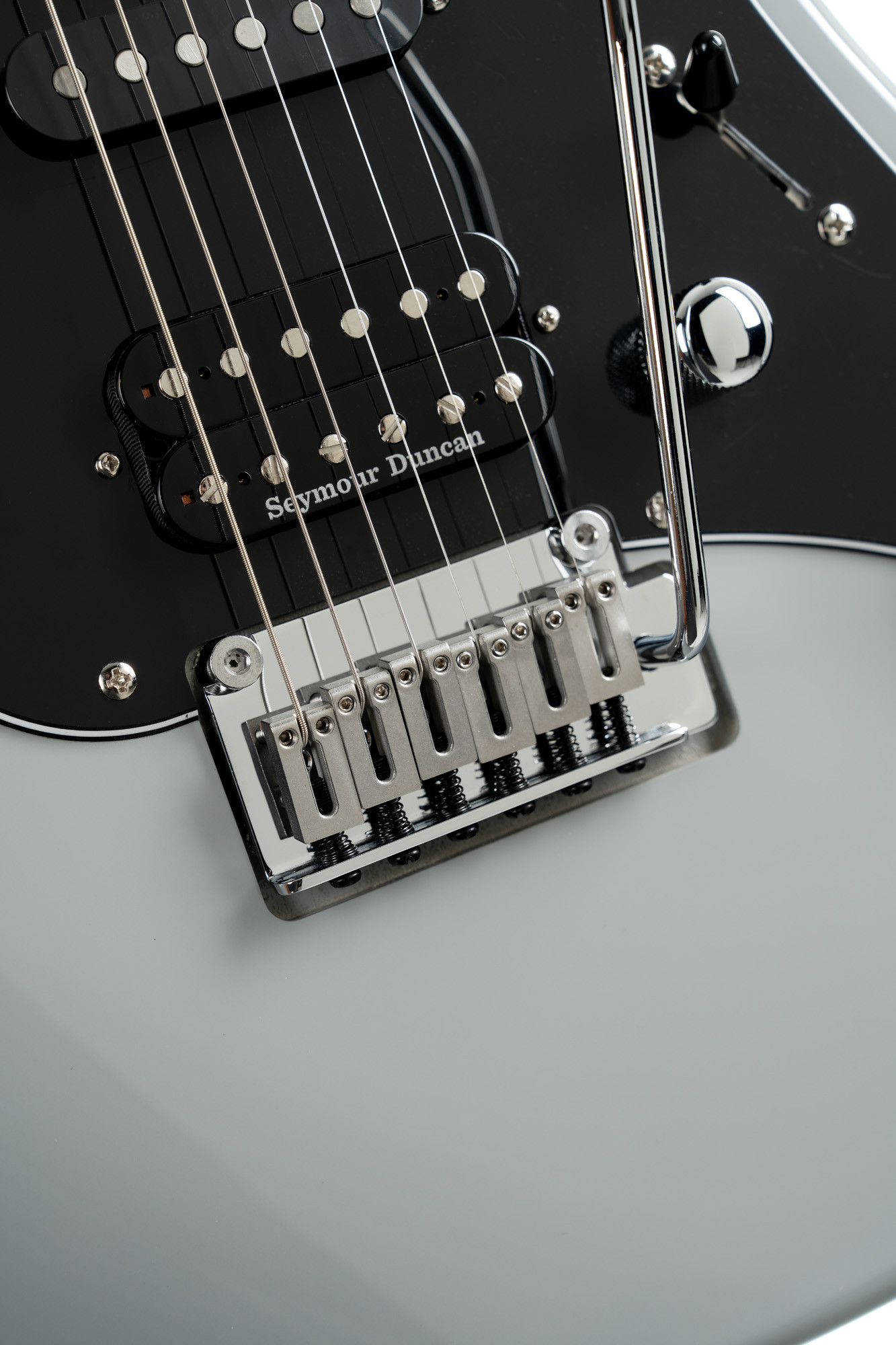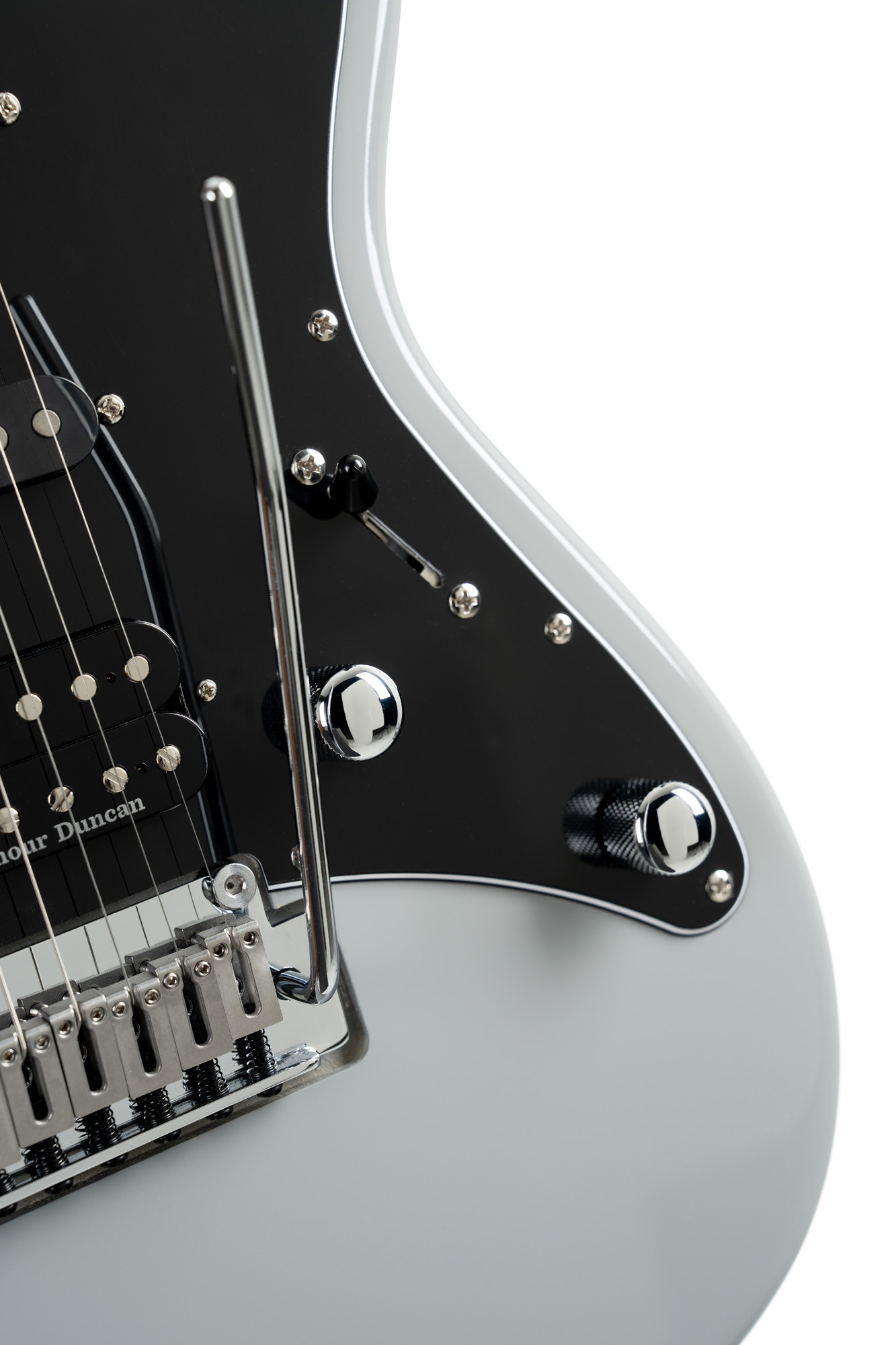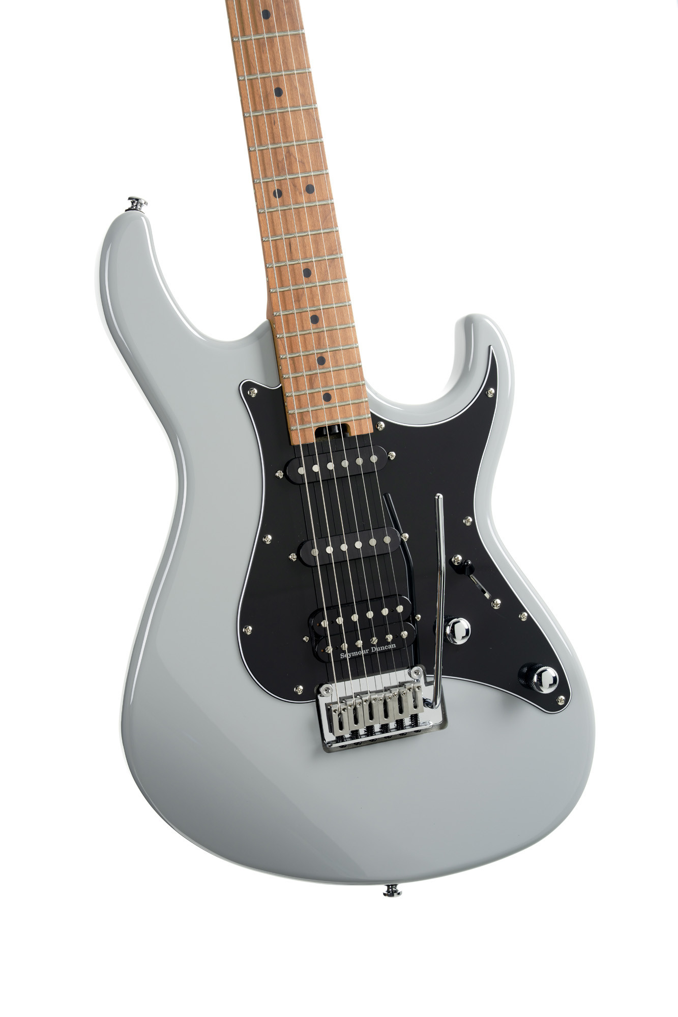Poplar body, roasted maple neck and fingerboard, HSS pickup configuration with 2 Voiced Tone VTS-63 pickups and 1 Seymour Duncan TB4 pickup, pale graphite finish.