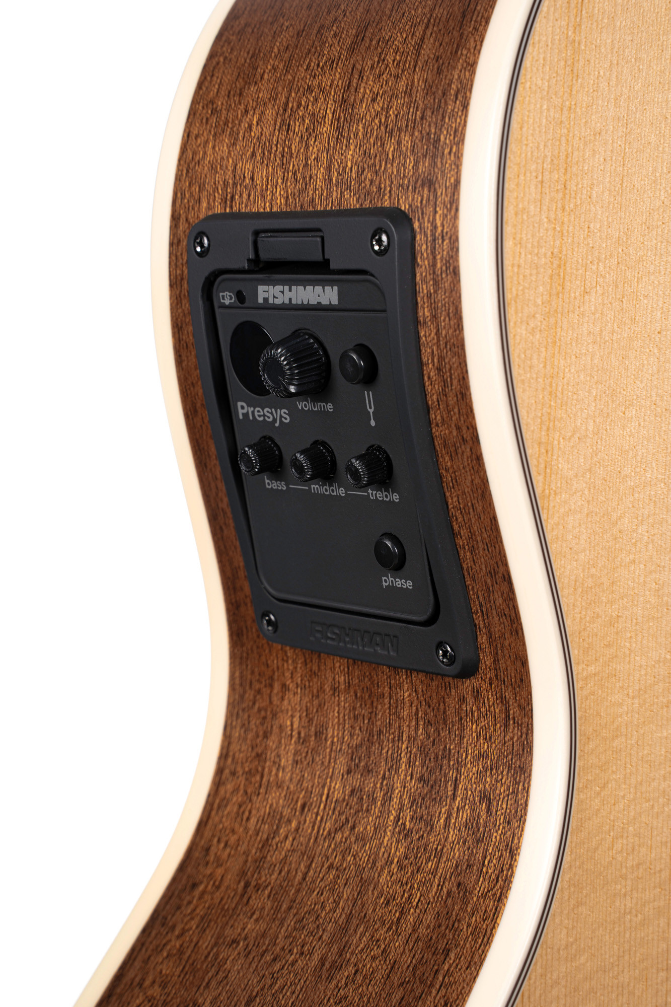 It stands out for its solid Sitka spruce top, solid mahogany back and sides, bone nuts and saddle, as well as a Fishman Presys electronic system with Sonicore pickup.