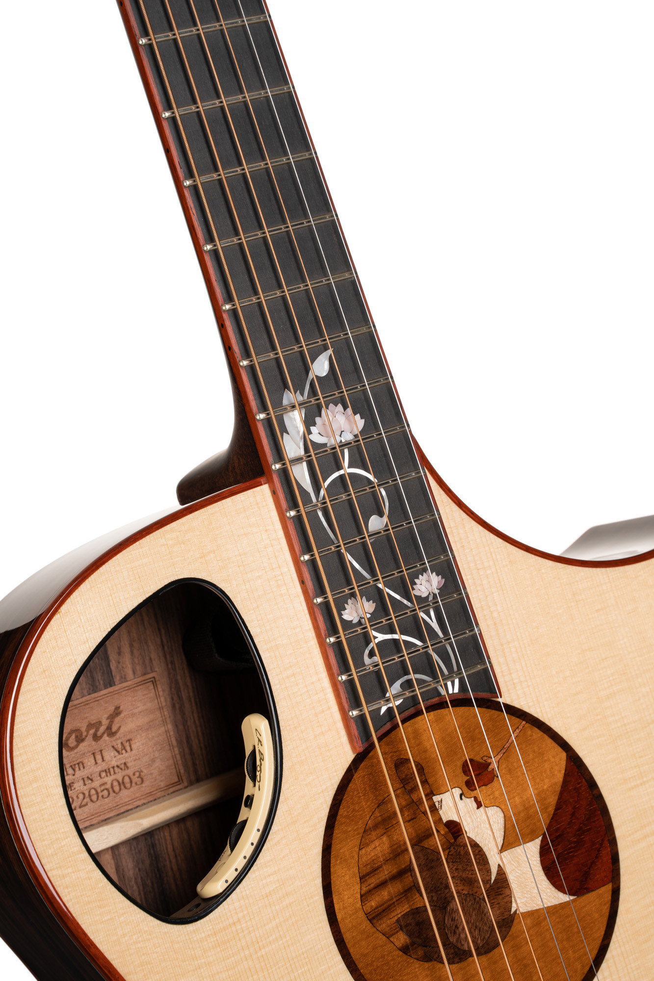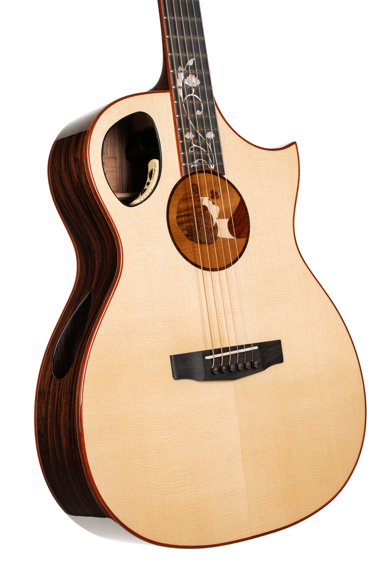 An Orchestra Model acoustic instrument with a Florentine cutaway, this reference combines a solid European spruce top with solid AAA pau ferro back and sides for a premium build. The 5-piece mahogany/walnut neck, ebony fingerboard and bridge, as well as the “Roselyn” inlays on the neck and soundhole rosette, provide comfort, elegance and refined finishing. The guitar is equipped with an LR Baggs Anthem EQ system, gold Gotoh 510Z tuning machines, ebony pins, a 44.5 mm nut and 20 frets. The UV finish is designed to optimize acoustic properties, while the Light 12-53 Elixir Nanoweb Phosphor Bronze strings complete the package. Delivered with a deluxe case, it is offered in glossy natural.