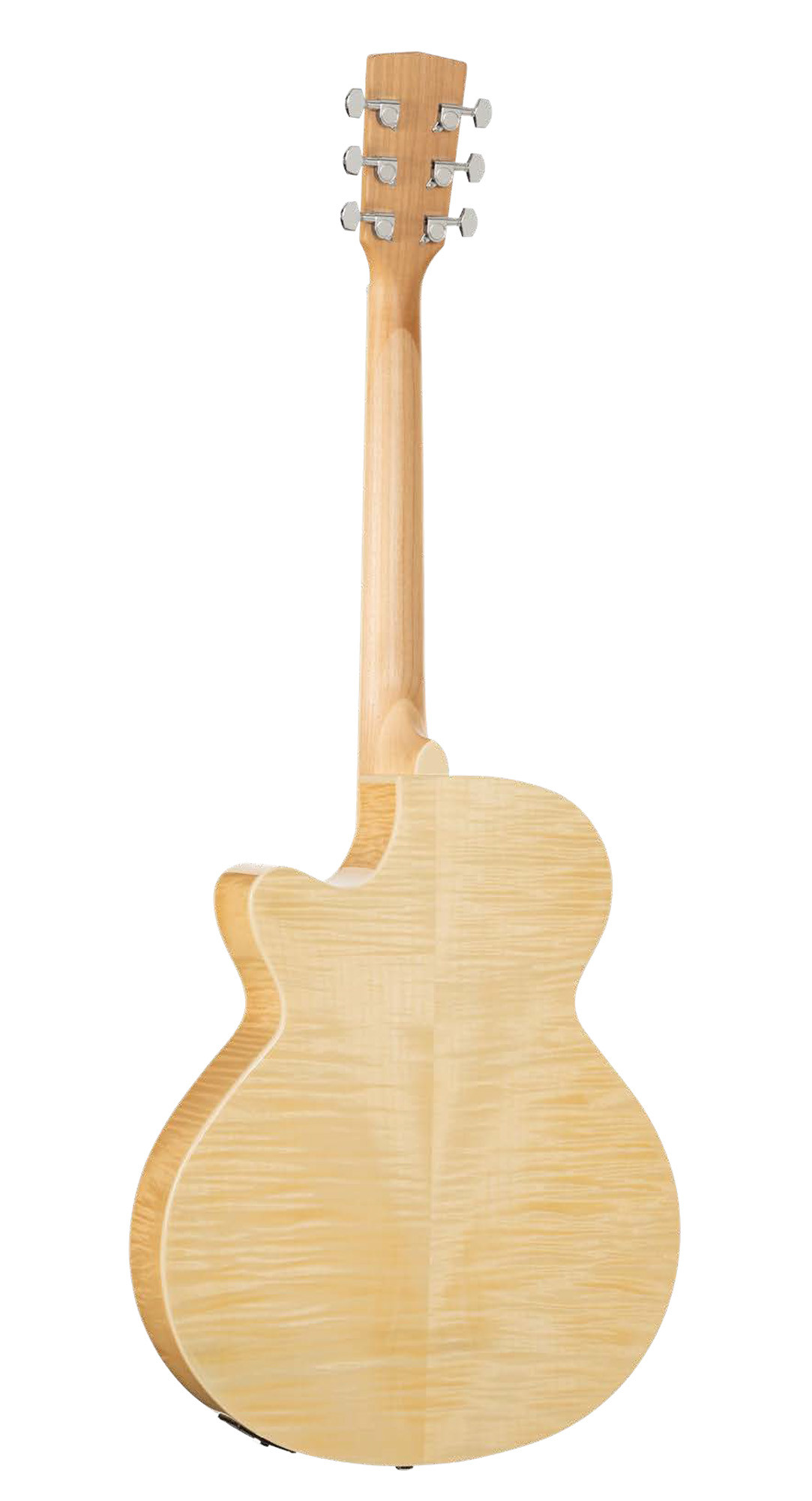 It stands out for the combination of flamed maple on the top, back and sides, its Cort CE304T electronics, and its natural gloss finish, which give it a clear identity in its category.