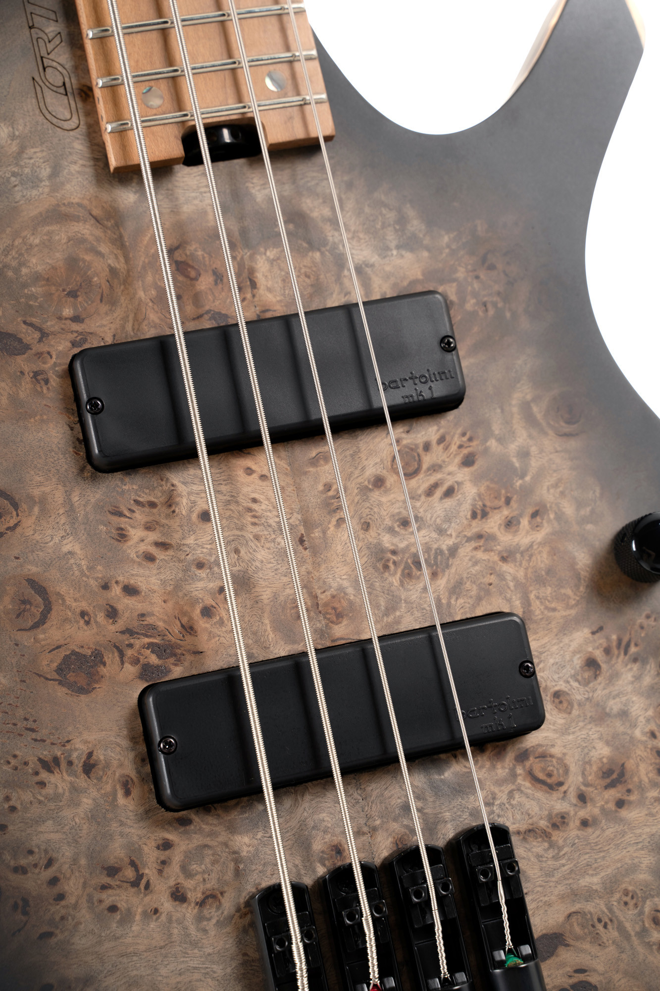 A modern headless 4-string bass designed to offer a current feel and a carefully considered technical setup. It combines a maple body with a figured poplar top, as well as a 7-piece neck made of roasted maple, walnut, purpleheart, and maple. The maple fingerboard, two MK-1 humbucking pickups, and Bartolini MK-1 active EQ complete the package. Star dust black finish, zero fret, black hardware, and gig bag included.