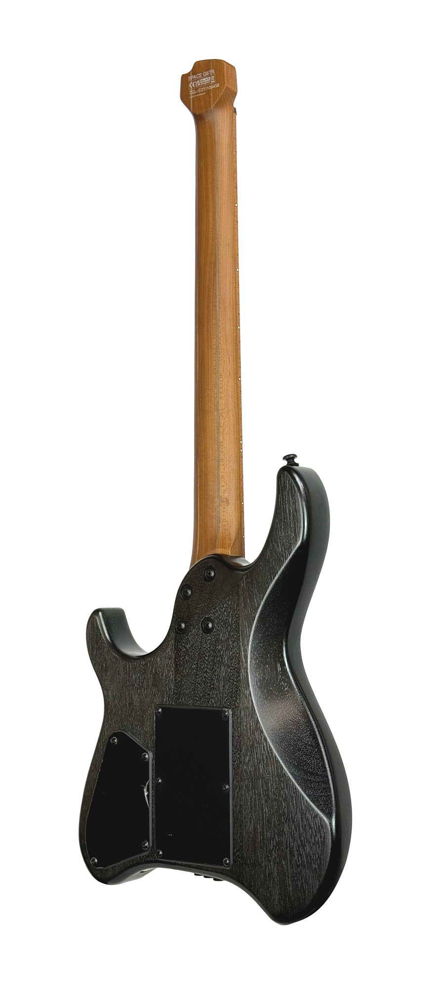 The SPACE G6TR features a headless “space” shape to deliver a modern and comfortable playing experience. Its okoumé body with flamed maple veneer gives it a refined look, while its 5-piece roasted maple and walnut neck, paired with a roasted maple fretboard, contributes to a serious and precise build. With 24 frets, a vibrato, black hardware, a PPS nut, D'Addario EXL110 strings, and a gig bag included, it is designed for guitarists looking for a complete instrument ready to support regular playing.