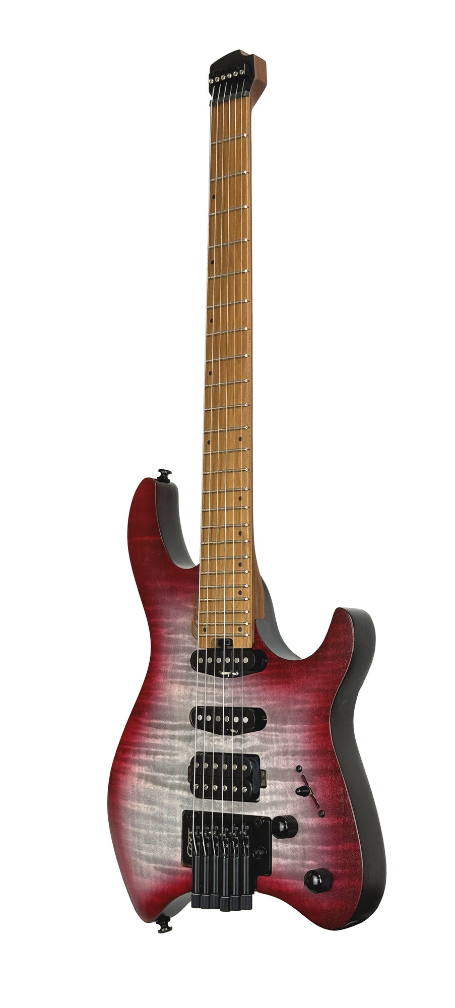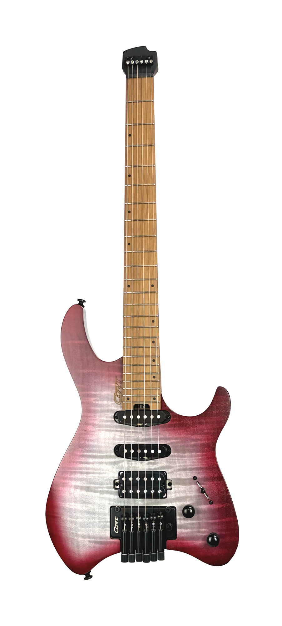 The SPACE G6TR adopts a modern headless shape and stands out for its carefully designed construction, intended to deliver playing comfort and versatility. Its okoume body with flame maple veneer, 5-piece roasted maple and walnut neck, and roasted maple fingerboard contribute to a precise and balanced playing feel. Equipped with 24 frets, a vibrato bridge, one Cort Voiced Tone VTH77 humbucker and two VTS63 single-coil pickups, it offers a wide tonal range thanks to its 5-position selector, volume, and tone controls. It also features luminescent side dots, black hardware, a PPS nut, D'Addario EXL110 strings, and comes with a gig bag.