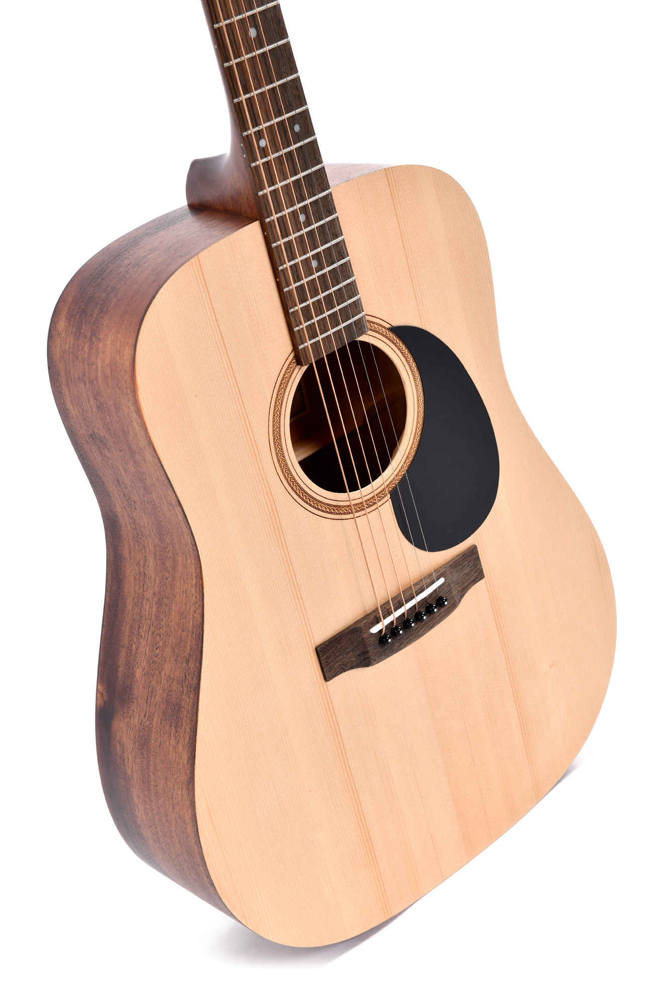 Designed to deliver a powerful, balanced sound, this guitar combines a Sitka spruce top with mahogany back and sides. Its Dreadnought shape promotes excellent projection, while its natural satin finish highlights the wood’s authentic look.