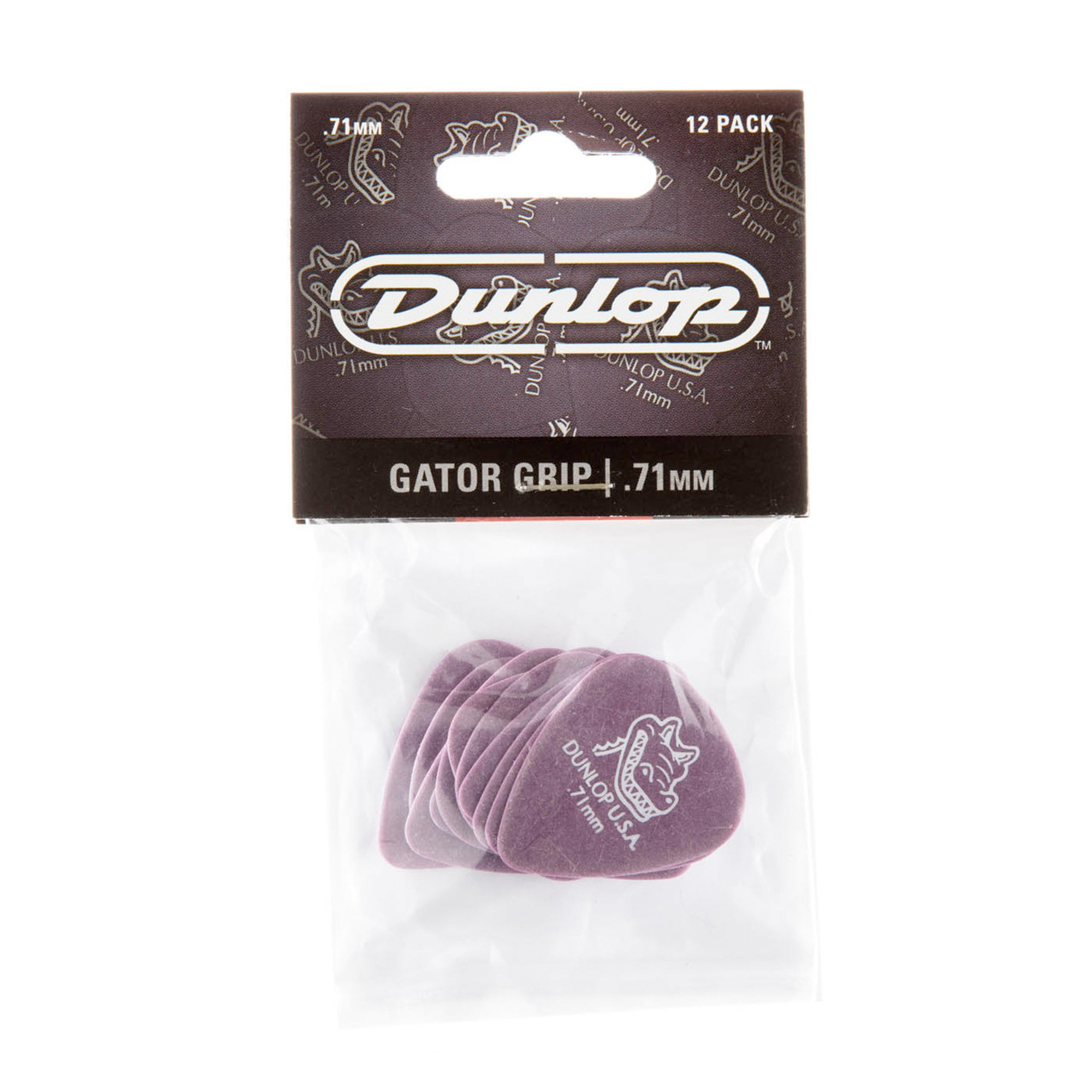 This product offers a convenient pack of 12 Dunlop Gator Grip 071 picks, with a 0.71 mm thickness and a clearly identified purple finish.