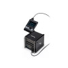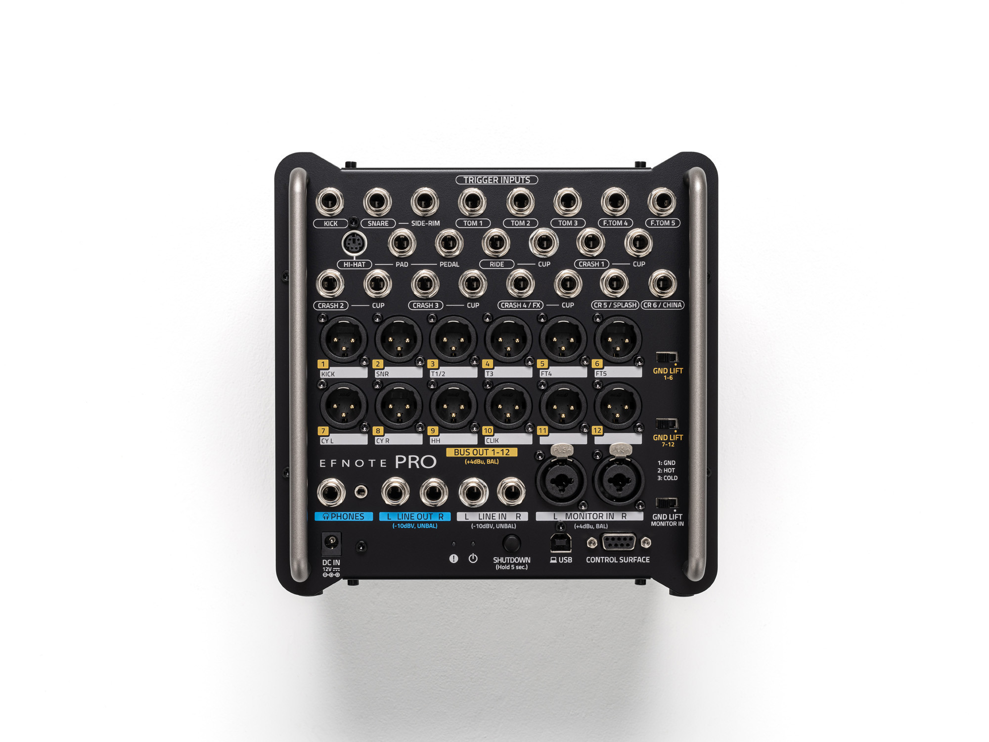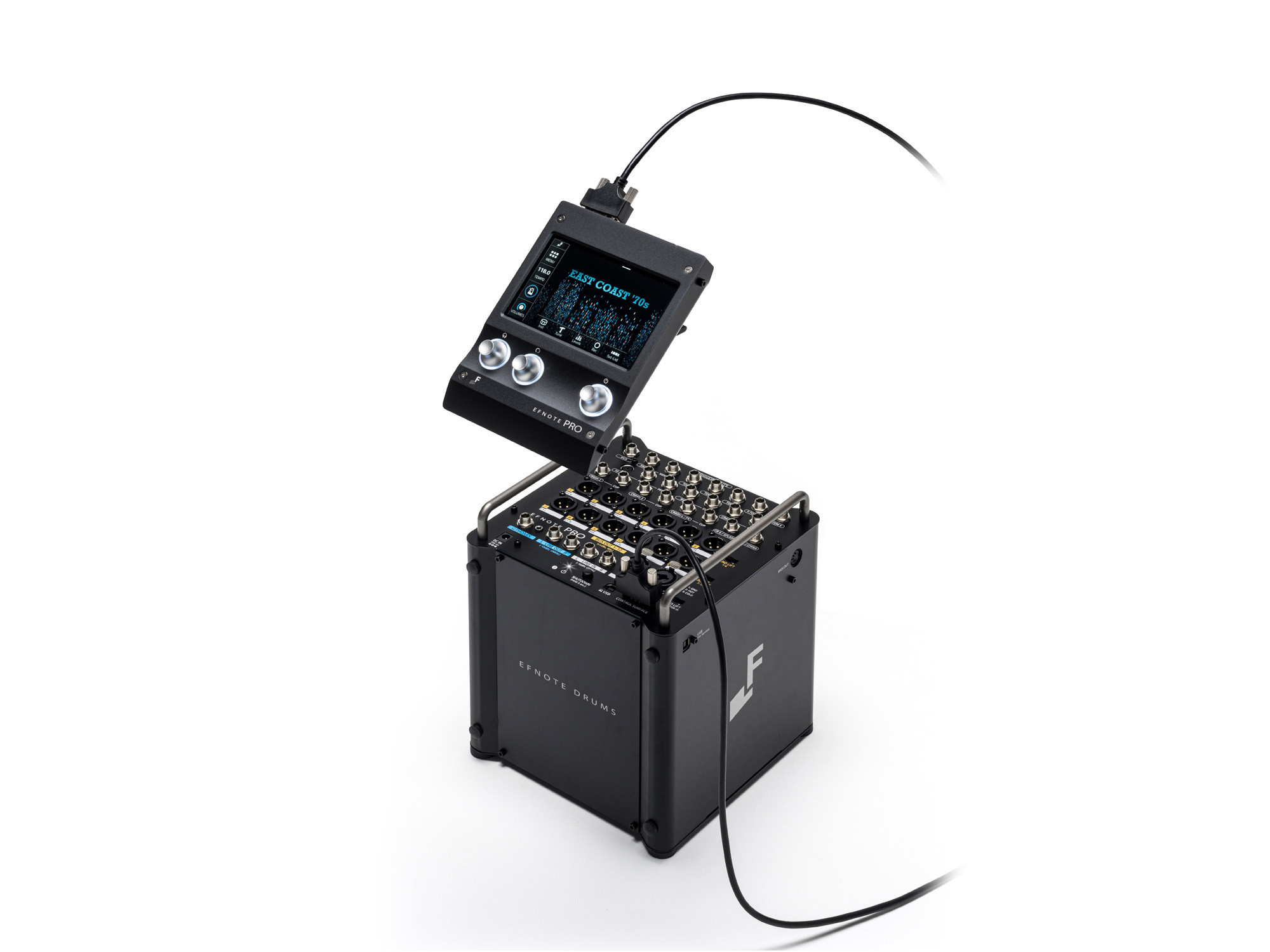 For sound processing, it includes 3-band EQ, a compressor, and a Master EQ. On the connectivity side, the associated stage box allows up to 15 pads to be connected and offers numerous digital and analog outputs: 2 unbalanced 6.3 mm jack outputs, 1 6.3 mm jack headphone output, 2 XLR-Combo monitor outputs, 2 unbalanced 6.3 mm jack inputs, as well as Bluetooth MIDI and Audio, USB MIDI in/out, and a DIN MIDI output.