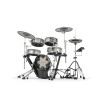 The setup is based on 6-ply birch shells and includes a 12" kick pad, a 12"x04" three-zone snare pad, two 10"x3.5" two-zone tom pads, one 12"x04" two-zone tom pad, a 12" two-zone hi-hat, a 14" three-zone crash with choke function, and a 16" three-zone ride with choke function. Three stands with mounts are included for all tom and cymbal pads, as well as a snare stand.