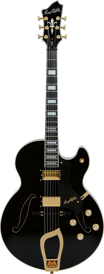 The HJ-500 is a hollow body electric guitar in a Black Gloss finish, designed with a Contoured Maple Ply top and body as well as a Set Neck maple neck. It is equipped with a Resinator floating bridge, a Hagstrom Trapeze tailpiece, two HJ-50 Alnico 5 pickups, and full electronics with 2 RC-Circuit volume controls, 2 tone controls, and a 3-way selector switch. Its scale length is 24.75", and it also features an H-Expander truss rod, Hagstrom 18:1 tuners, and a Resinator fingerboard.