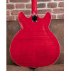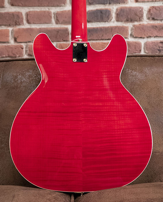 It features a flamed maple top, a maple body with F-Hole sound holes, as well as a bolt-on maple neck. The instrument is equipped with a Long Throw T-O-M, a Hagstrom Trapeeze bridge, 2 H-67 pickups, the H-Expander Truss Rod, Hagstrom 18:1 tuners, and a Resinator fingerboard.