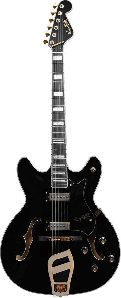 This reissue of the original 1967 model, also known as the “Elvis” model, captures the spirit of an iconic guitar with careful design and features faithful to its heritage. Its black finish, maple top and maple body with F-holes give it a strong visual identity, while the bolt-on maple neck provides classic construction. It is equipped with a Hagstrom Trapeeze bridge, a long throw T-O-M, 2 x H-67 pickups, the H-Expander truss rod system, Hagstrom 18:1 tuners and a Resinator fingerboard.