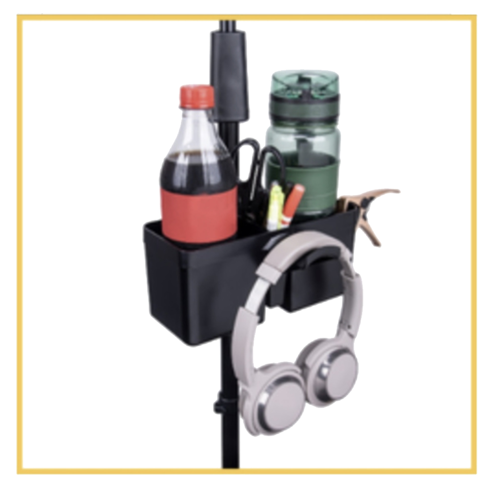 It is for users who want to keep a drink and a helmet close at hand, with simple mounting on a compatible stand.