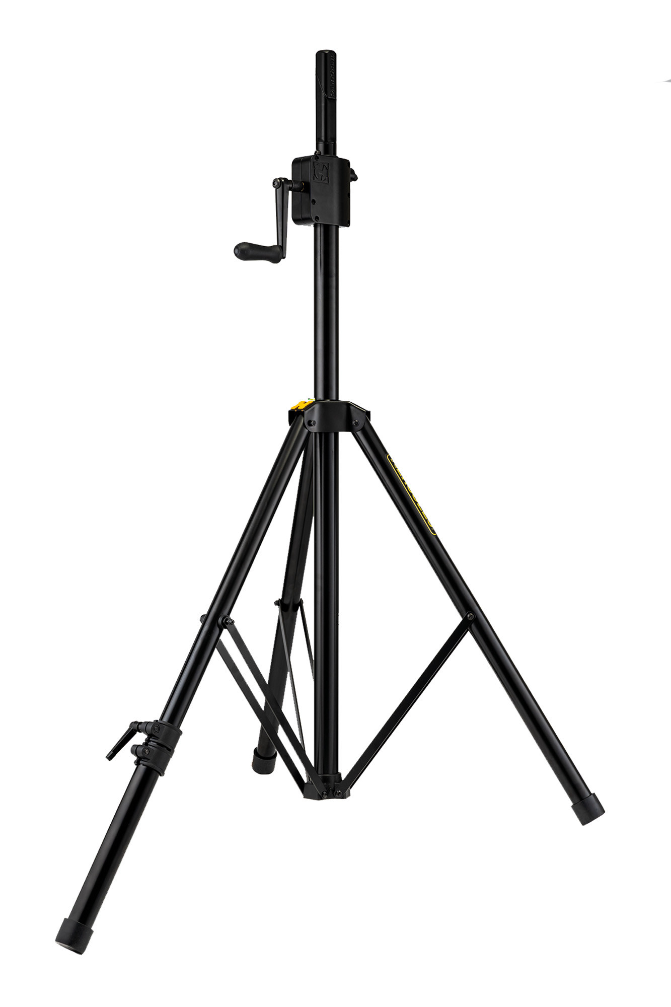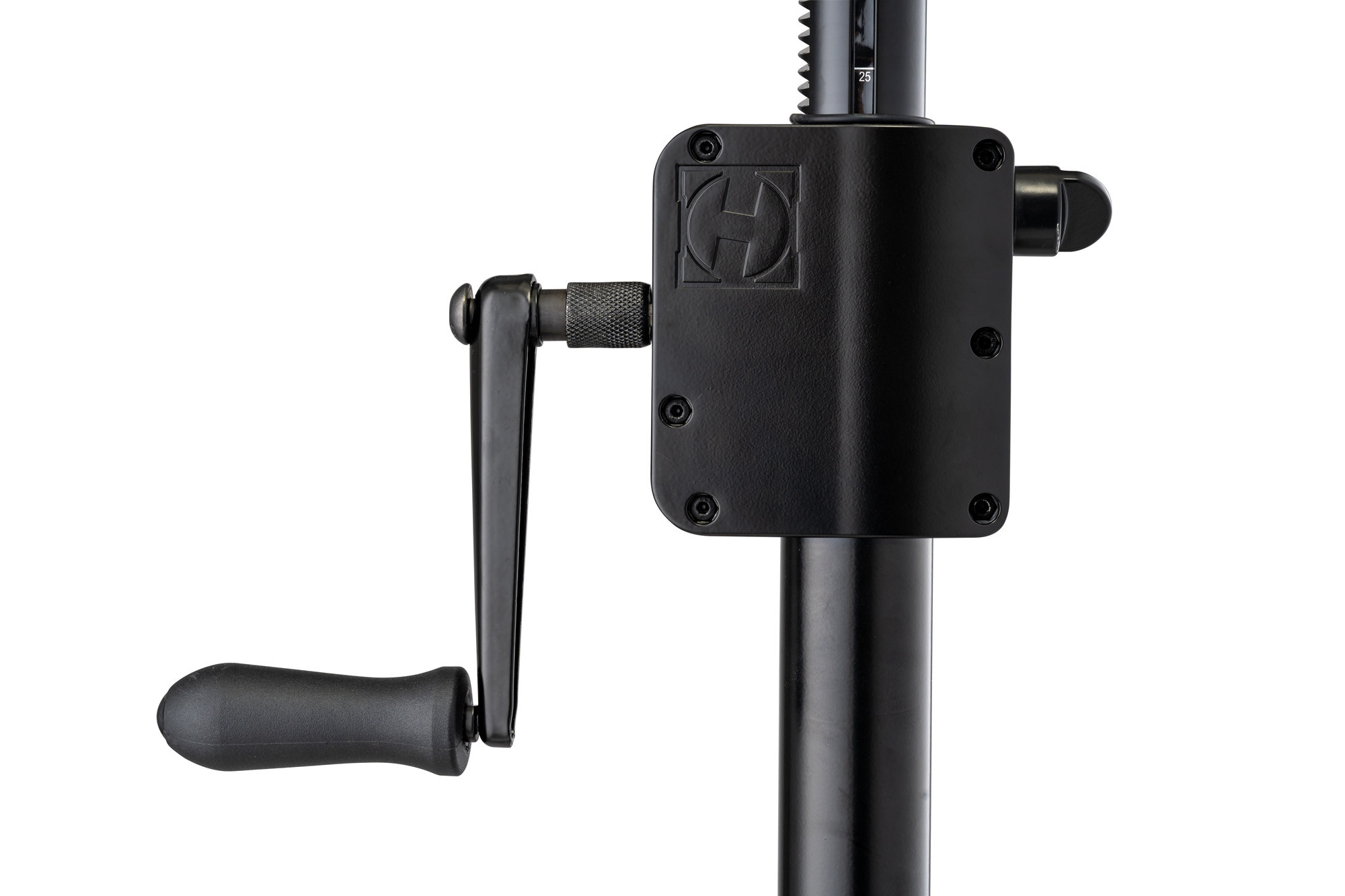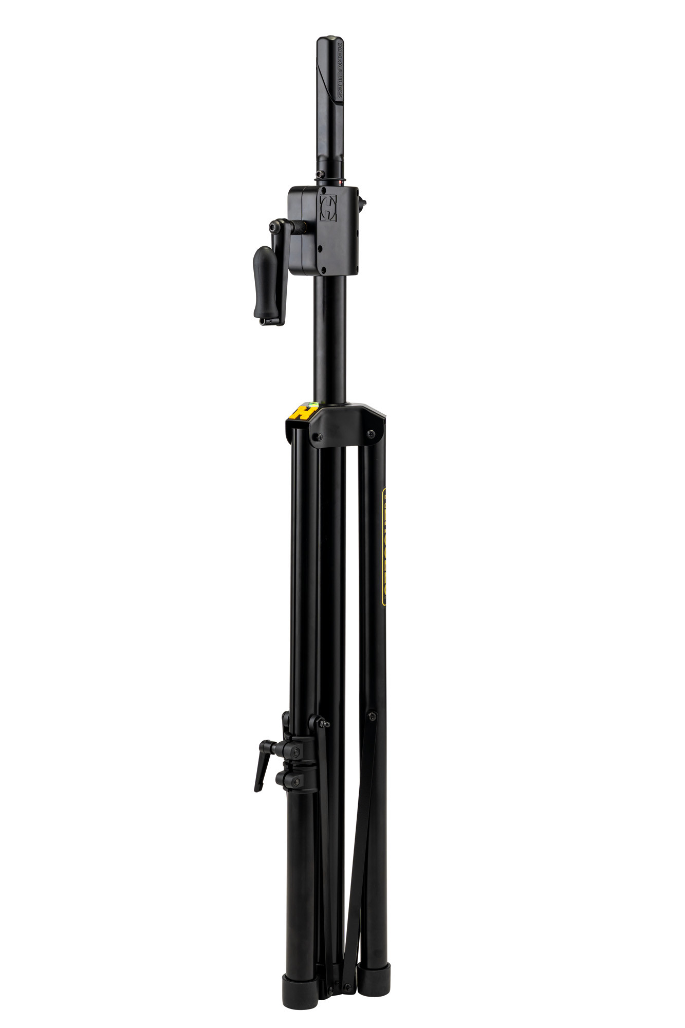 Speaker stand with EZ adapter, foldable crank, adjustable foot for uneven floors, integrated spirit level, height scale on the tube, robust steel construction, and 3-piece design for compact storage and excellent stability at maximum height.