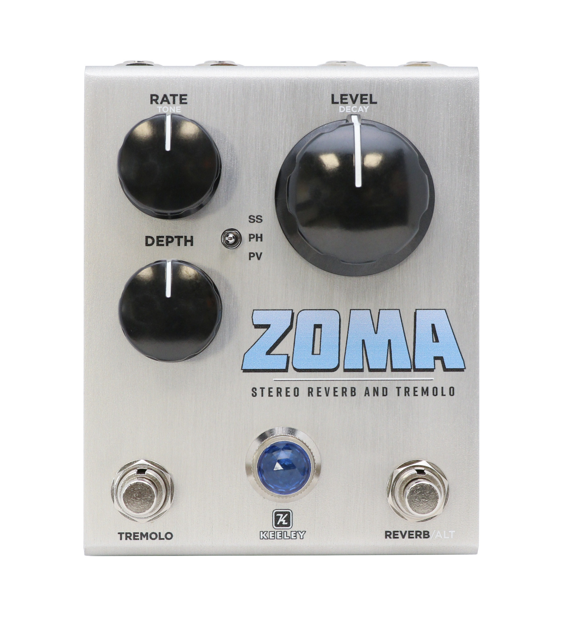 ZOMA pedal, stereo reverb and tremolo, 3 modes, switchable effect order, metal housing, gray