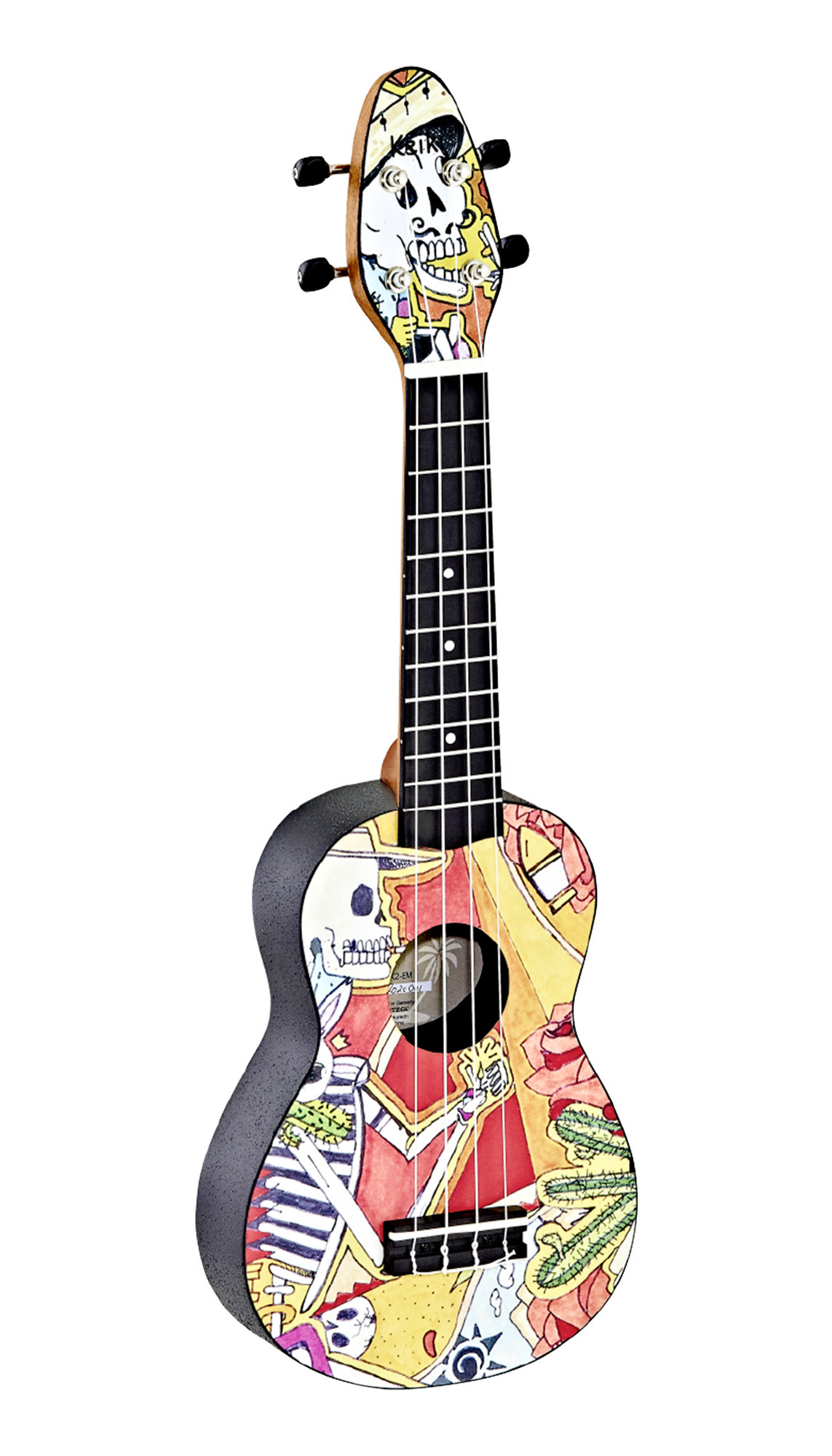 K2-EM, soprano ukulele pack with agathis top in the « El Muerto » design, arched ABS body, okoume neck, 12 frets and included accessories.