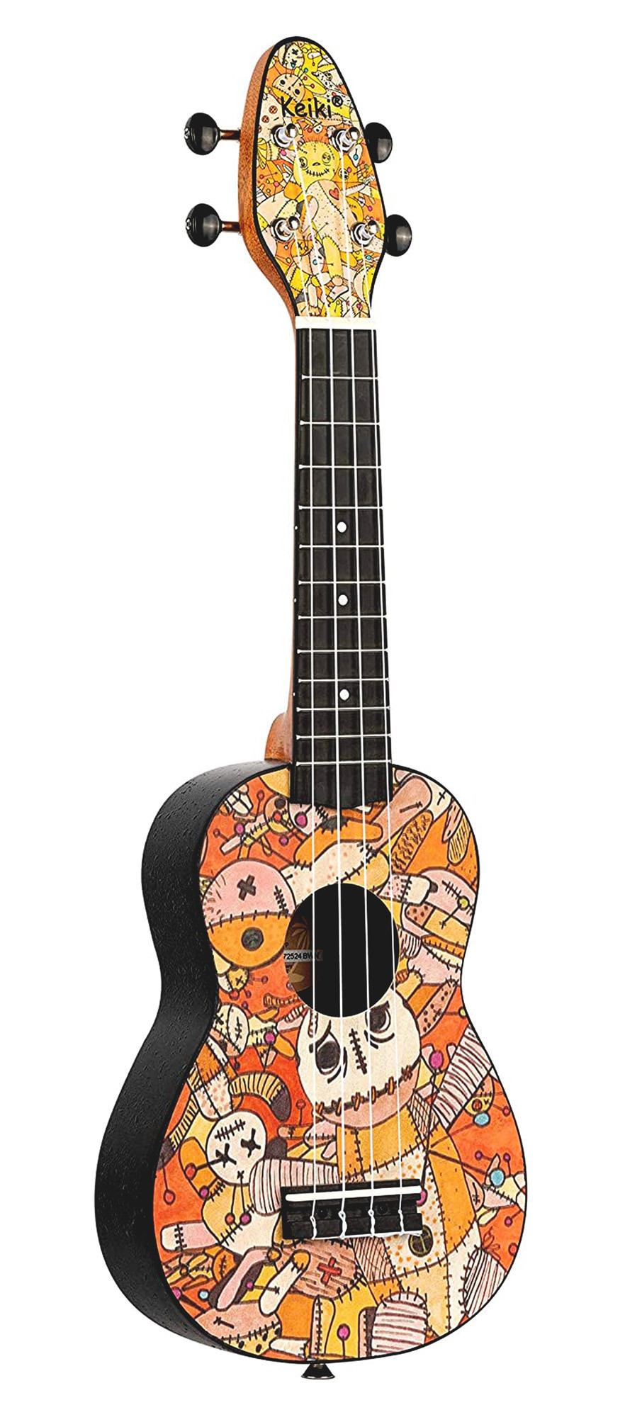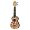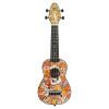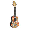 This pack includes a soprano instrument with a Voodoo Puppet design, featuring an agathis top, a slightly arched ABS body, and an okoume neck. It has 12 frets, a 364 mm scale length, an ABS fingerboard and bridge, as well as open gears with black buttons. Ortega strings are already installed for immediate use.