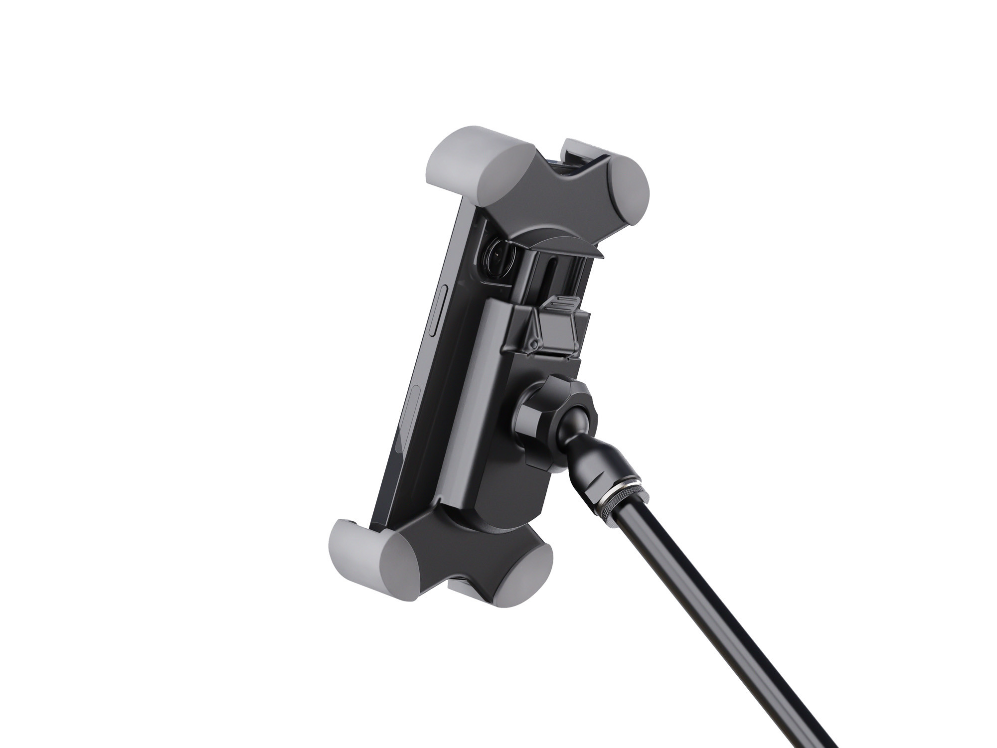 K&M 19753 universal smartphone holder, designed for simple and reliable mounting with 3/8" and 5/8" threading. Its steel and plastic construction allows versatile use, while its adjustment system adapts easily, without tools, to many smartphone models. The holder swivels freely through 360° to adjust the orientation to your needs.