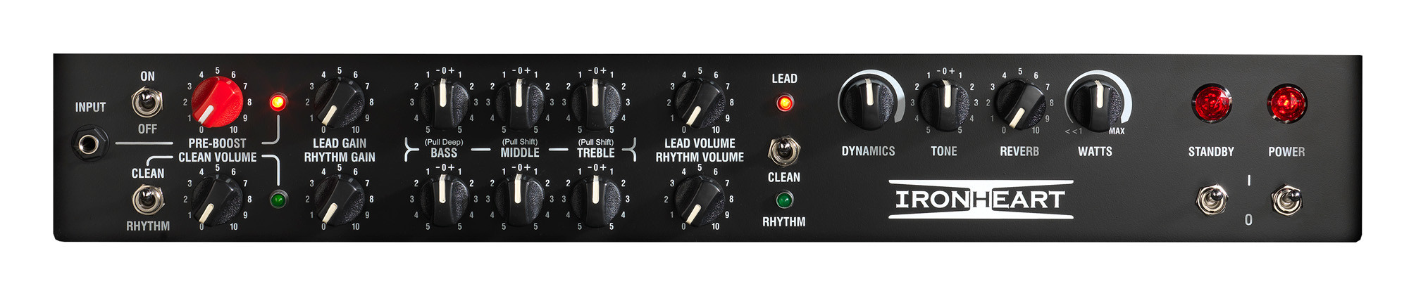 This valve-powered head combines 60W of power with a power section using 2 x 6L6 and a valve preamp with 4 x 12AX7/ECC83. Designed and manufactured in England, it offers a complete setup for guitarists looking for a versatile format and valve tone. It features three distinct channels — Clean, Rhythm and Lead — as well as a Vari-Watt control, pre-boost on all three channels, a 3-band push-pull EQ, reverb and an effects loop. A 4-switch footswitch (FS4-IRT) is included. The package is completed by red internal illumination, dimensions of 67.8 x 27.1 x 28.8 cm and a weight of 16.5 kg.