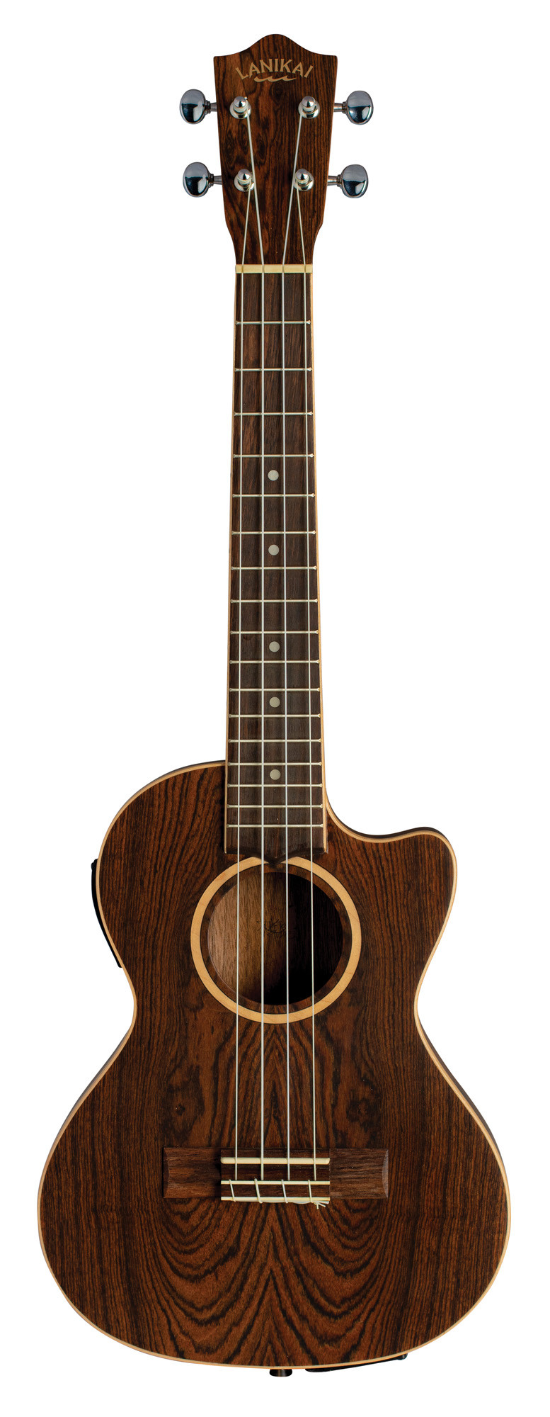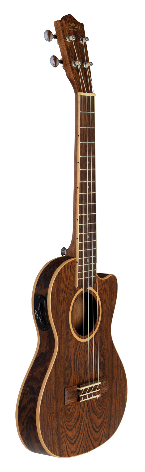 Its construction highlights selected woods such as figured bocote, an arched back, maple finishes, and a Lanikai EQ with volume and tone controls.
