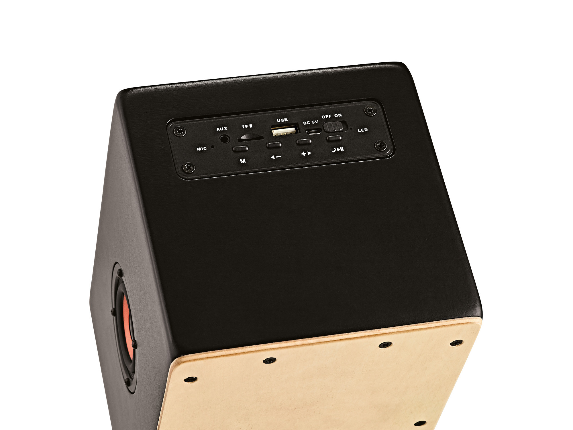 Mini preamp cajon speaker serving as a Bluetooth® speaker.