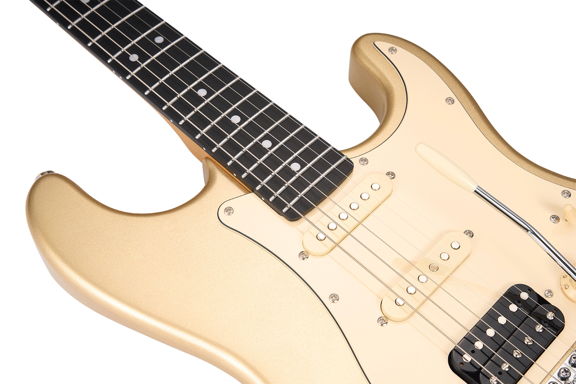 The MOOER MSC10 ELITE in Gold finish is an electric guitar designed to offer a comfortable feel and a versatile setup. It combines a poplar body with a satin roasted maple neck in a C profile, complemented by a 12" tech ebony fingerboard. It comes with a gig bag.