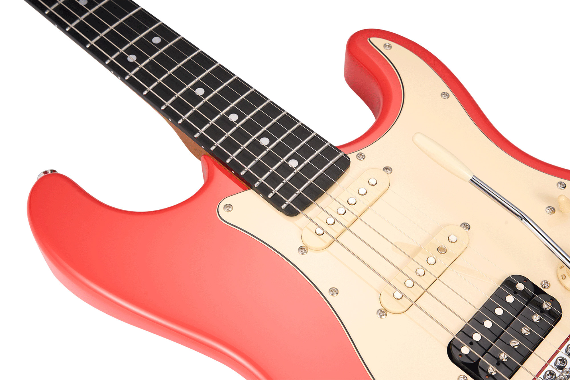 It has 22 frets, an S-S-H pickup configuration with two MSC-1N/M pickups and an MHB-1B humbucker, as well as a 5-way selector switch. It also features one volume control, two tone controls, MTN-1 chrome tuners, 09-46 strings, an MVT-1 Vintage tremolo, and chrome hardware.