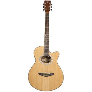 Mini jumbo electro-acoustic guitar with cutaway, designed to offer a comfortable grip and good playing versatility. Its spruce top helps deliver clear projection, while the agathis back and sides provide a structure suited to regular use. The maple neck ensures a stable playing feel, and the fingerboard and bridge in compound rosewood complete a coherent and balanced setup.