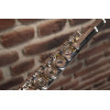 It offers a silver-plated nickel silver head joint, a silver-plated body and keys, inline G keys, and cork pads, with included accessories such as a cleaning rod, a cloth, and a hard case.