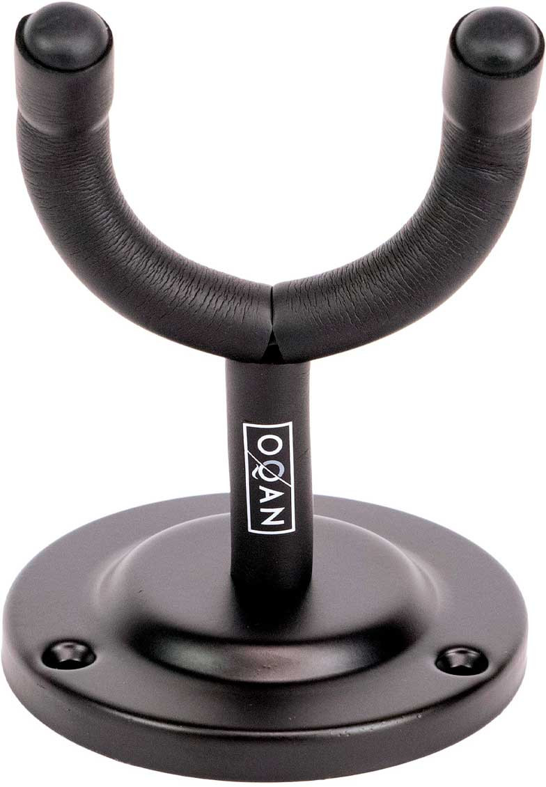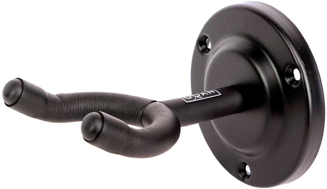 Wall mount for electric or acoustic guitar designed to provide practical and secure support. It features a rubber-coated grip to help protect the instrument at the contact point. It is a recommended option for shops or displays. Available in charcoal grey.