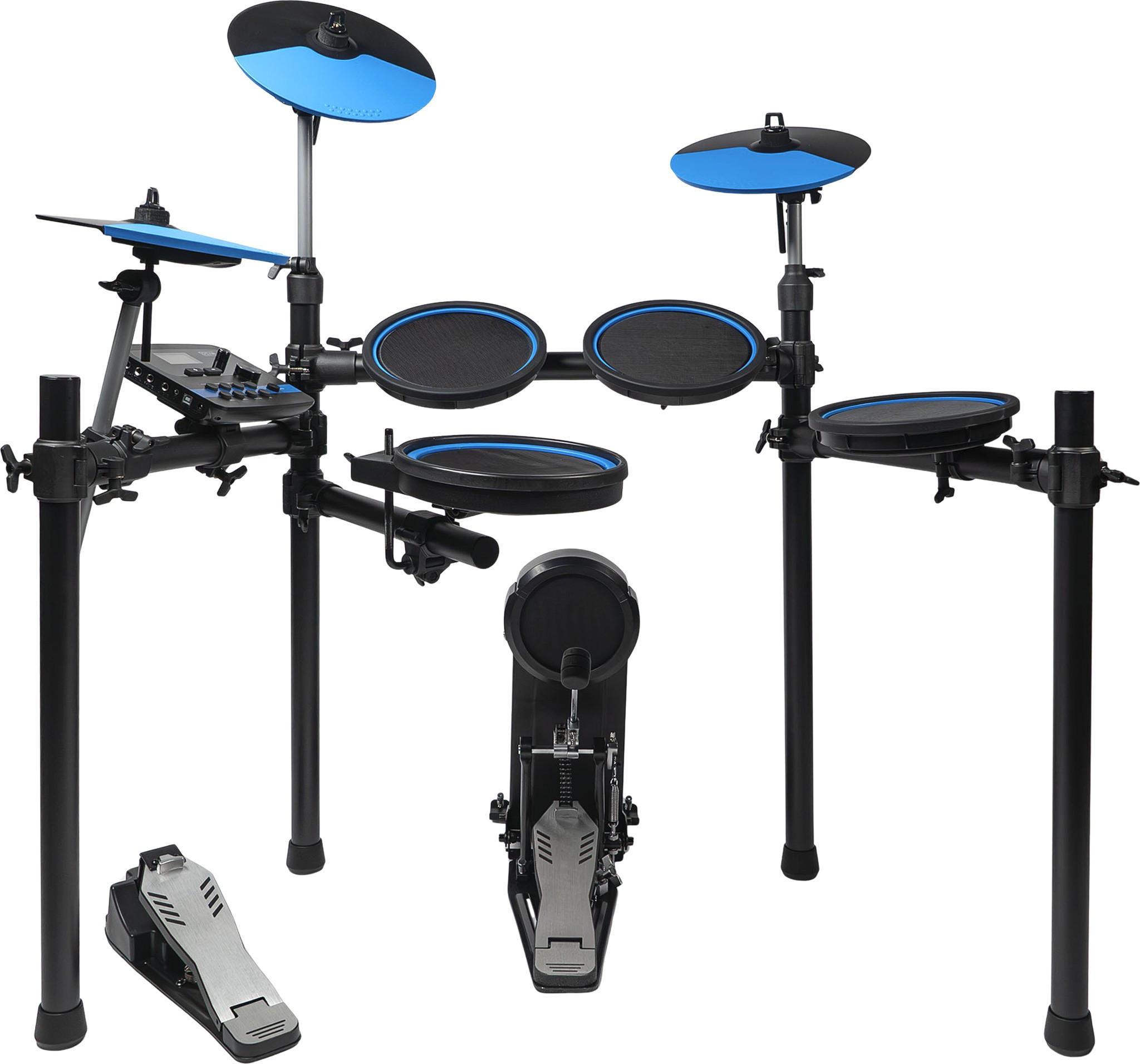 Designed for a realistic and expressive playing experience, it features an 8'' kick pad compatible with a double pedal, a 10'' snare with mesh head and adjustable tension, as well as three 10'' cymbal pads with choke function. Bluetooth connectivity, the built-in equalizer, digital effects, and the metronome with 10 songs make it a complete and practical instrument for everyday use.