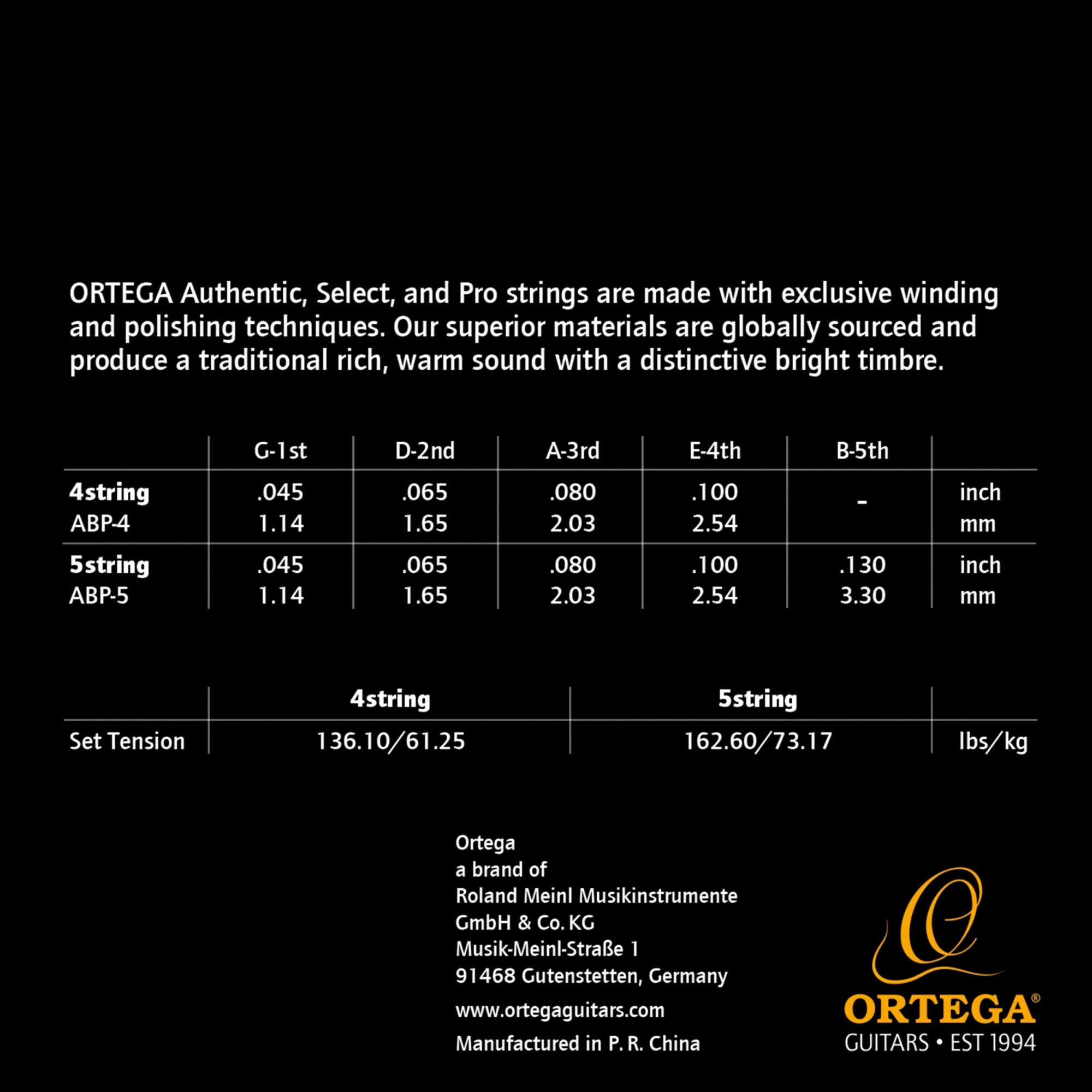 This set stands out for its compatibility with the Ortega Custom Pro acoustic bass, its 34" scale, and its anti-corrosion coating, while retaining the 45-65-80-100 configuration.