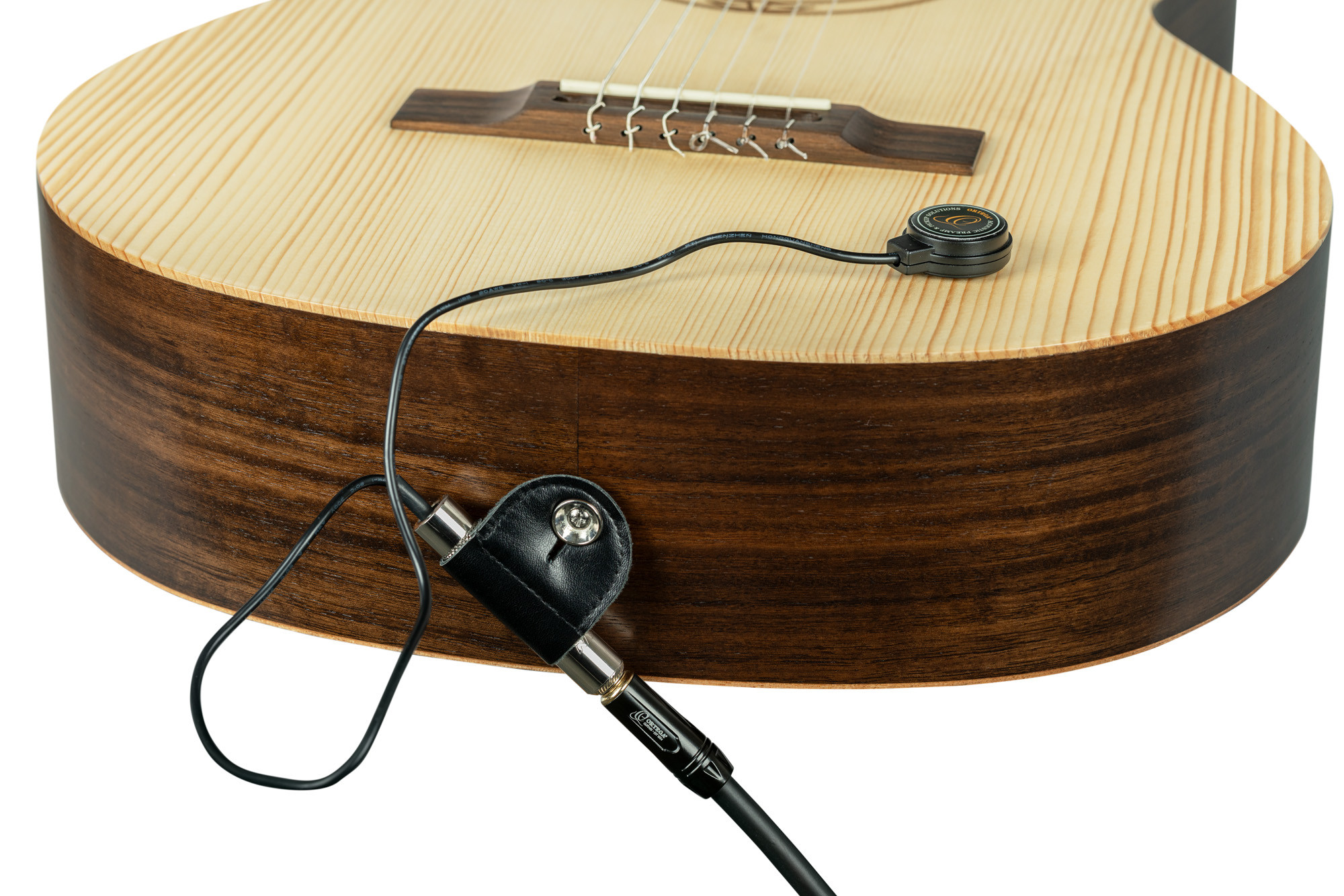 This removable universal preamp is designed to fit many instruments thanks to its adhesive tape or putty mounting system. It is suitable for different types of instruments such as guitar, bass, ukulele, resonator, banjo, mandolin, or violin.