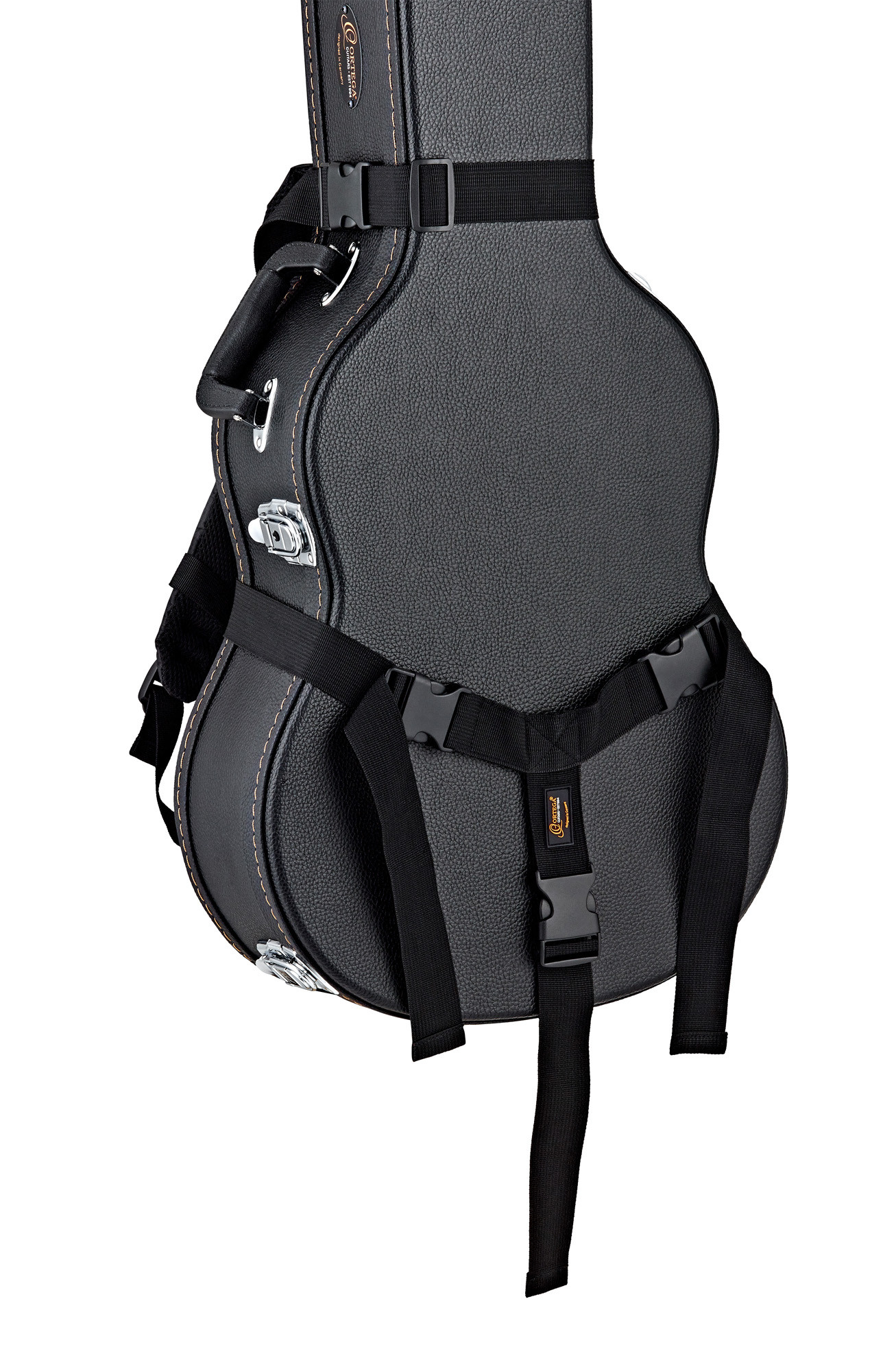 It is intended for people who want to carry a shaped hard case in a more practical and comfortable way thanks to an adjustable back harness.