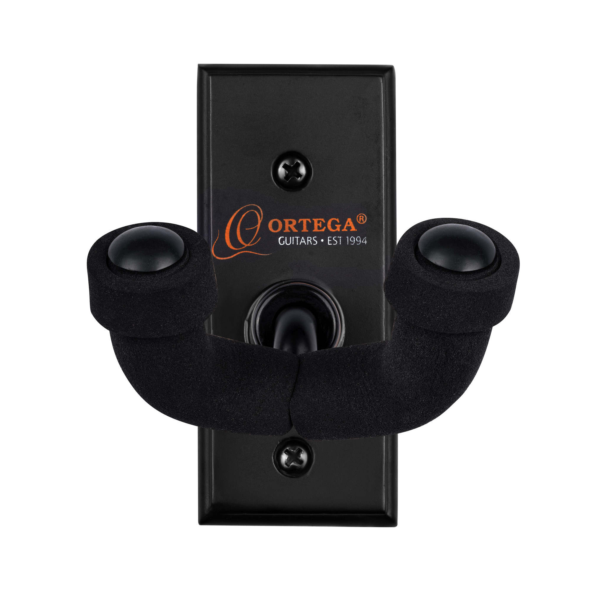 Wall mount for ukulele with wooden base, fixed with 2 screws and foam-covered bracket, black finish.