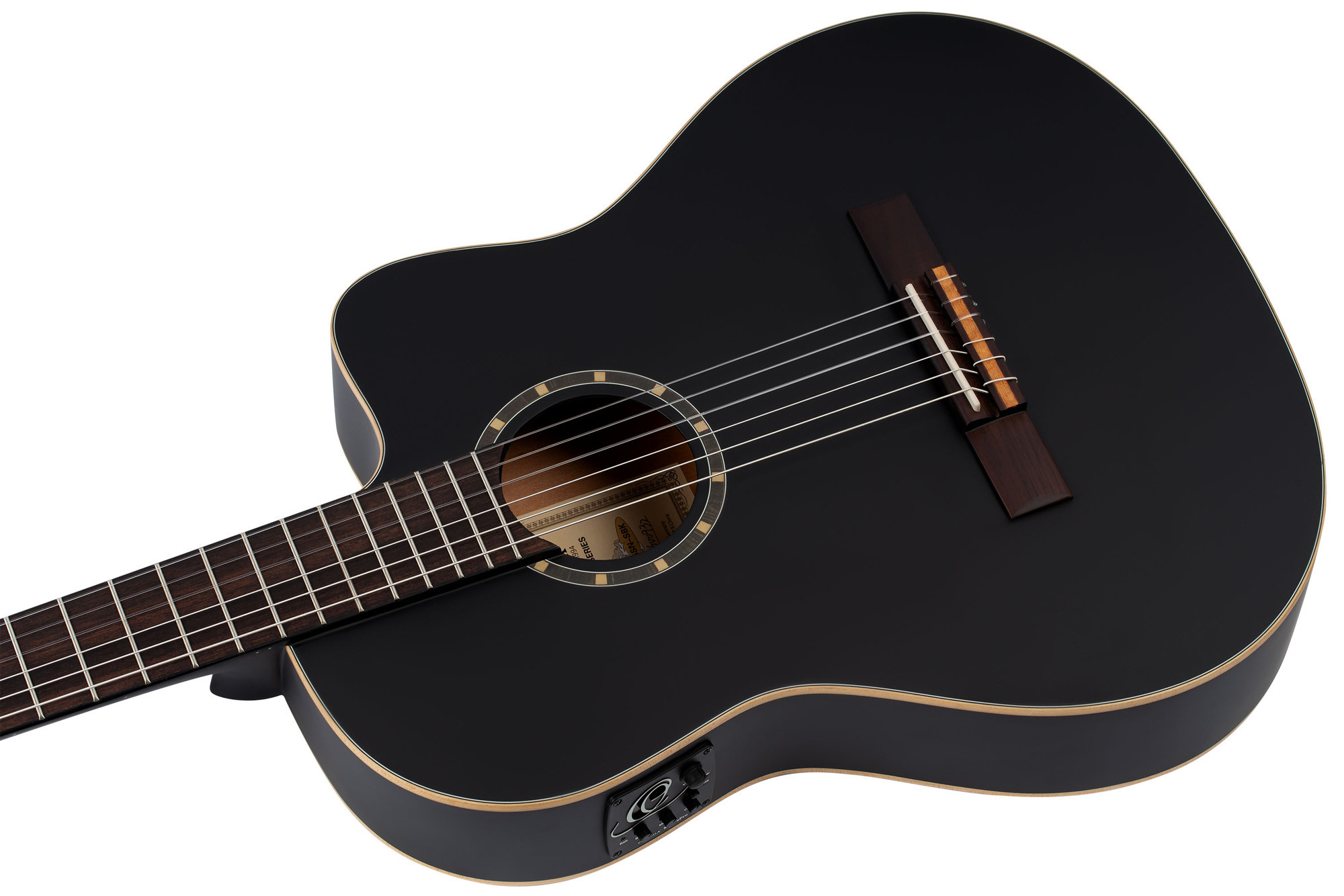 This Slim Neck cutaway model is equipped with an Ortega MagusPro system with built-in tuner, for convenient playing and easy setup both on stage and at home. Its spruce top, combined with the mahogany back and mahogany neck, offers a carefully crafted, cohesive design. The 48 mm nut suits those looking for a comfortable neck, while the walnut fingerboard and bridge, 12-hole bridge, double-action truss rod and Savarez 510CJ strings complete the package. A deluxe gig bag is included. Satin black finish.