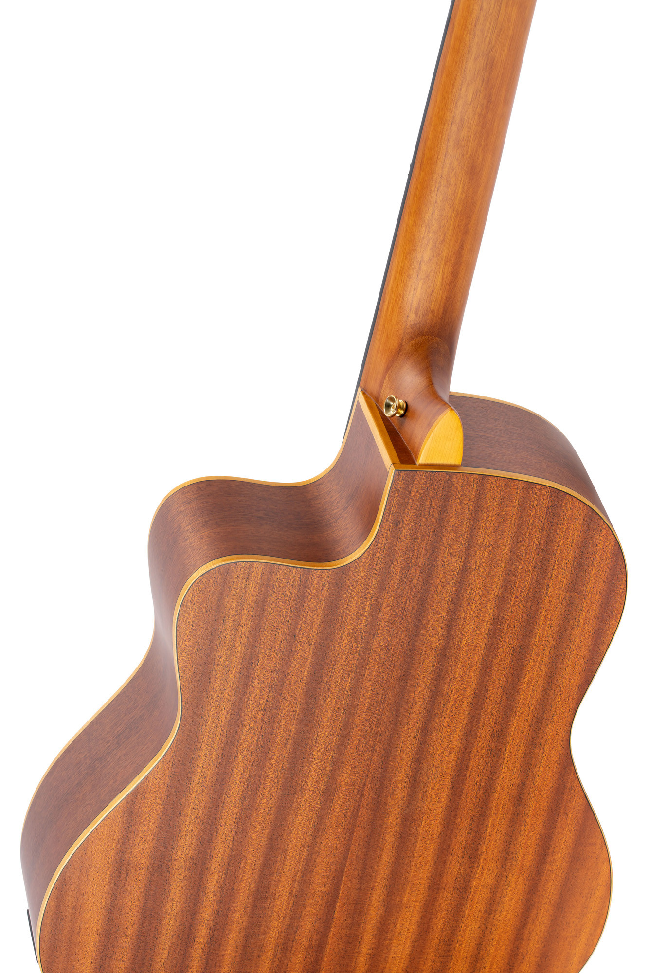 This model combines a design built for playing comfort with careful craftsmanship. With its Slim Neck format, cutaway body, and Ortega MagusPro electronics with built-in tuner, it is suited to guitarists looking for a practical, versatile instrument ready for amplification. The top in solid Canadian red cedar, the mahogany back and sides, as well as the flat fingerboard and sonokeling bridge, contribute to a complete and coherent build.