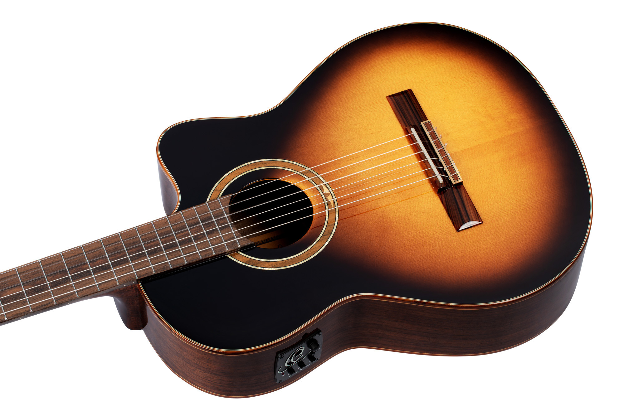 This RCE158SN model in Slim Neck format is designed to offer a comfortable grip and smooth playing. Its cutaway provides easy access to the high notes, while the Ortega MagusPro electronics with built-in tuner allow convenient use both on stage and during rehearsals. The solid Sitka spruce top contributes to a precise sound response, and the combination with the rosewood back and sides helps create a balanced overall tone. The mahogany neck, 48 mm nut, rosewood fingerboard and bridge, as well as the 12-hole bridge, complete this carefully crafted instrument. The Ortega signature rosette, double-action truss rod, Savarez strings and deluxe padded gig bag provide even greater playing comfort.