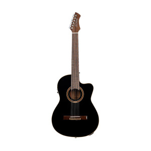 This electro-acoustic flamenco guitar stands out for its careful construction and components designed to provide precise, responsive playing. Its cutaway makes it easier to reach the high notes, while its MagusPro EQ system with built-in tuner allows for convenient amplification and quick adjustment. The solid spruce top delivers projection, and the cypress back and sides contribute to the lively response sought in this type of instrument. The mahogany neck, walnut fingerboard and bridge, as well as the 12-hole bridge, complete a functional and cohesive package. It comes with a padded gig bag and a glossy natural finish.
