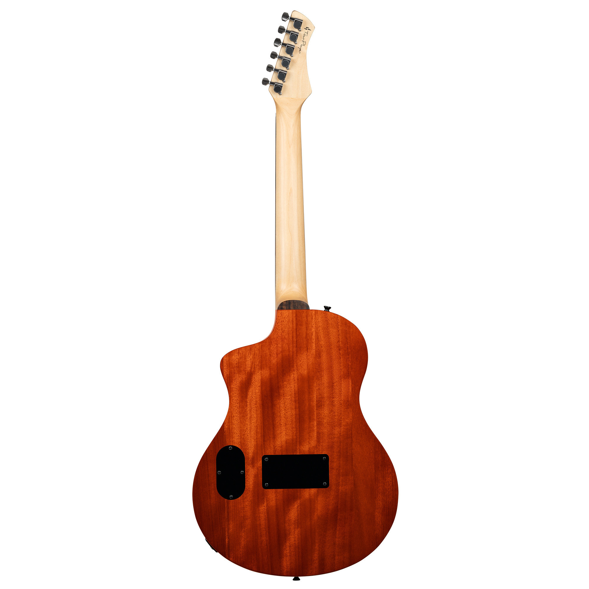 It stands out for its solid spruce top, flamed maple veneer, okoume back and sides, as well as its detailed construction with binding, armrest, and laurel bridge.