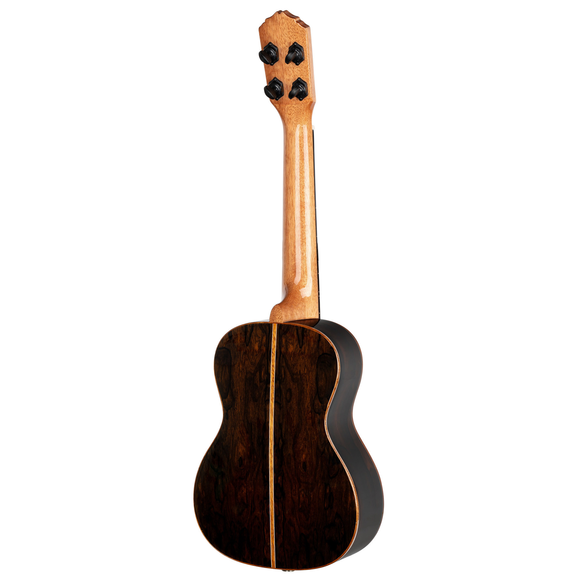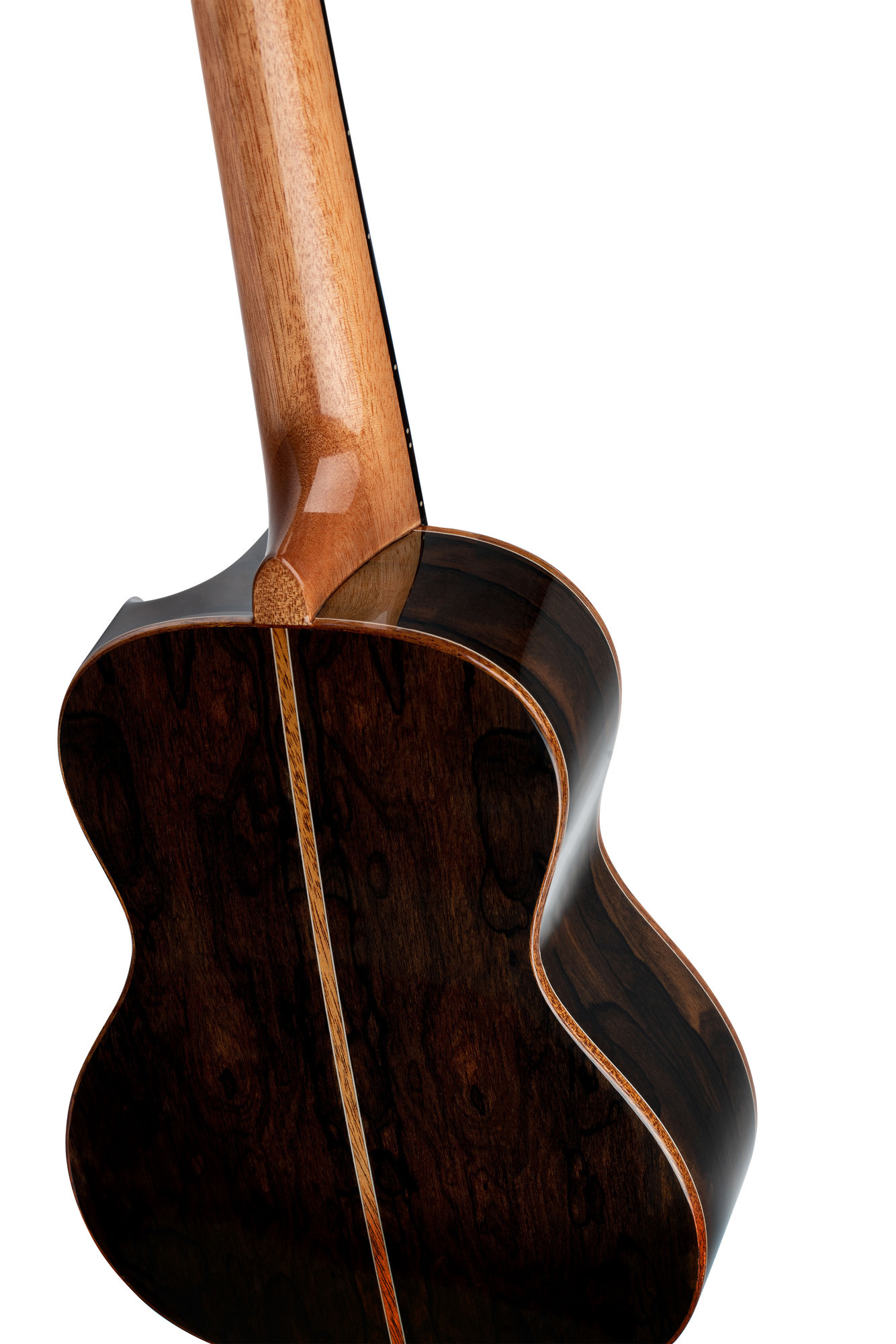 This model stands out for its selection of quality materials and components: solid ziricote top, ziricote back and sides, mahogany neck, walnut fingerboard and bridge, as well as abalone inlays in a tree of life style. The mahogany/maple binding, abalone soundhole rosette, and black Graph Tech tuners with black buttons complete the package. The 36 mm nut width and 380 mm scale length contribute to playing comfort suited to the concert format.