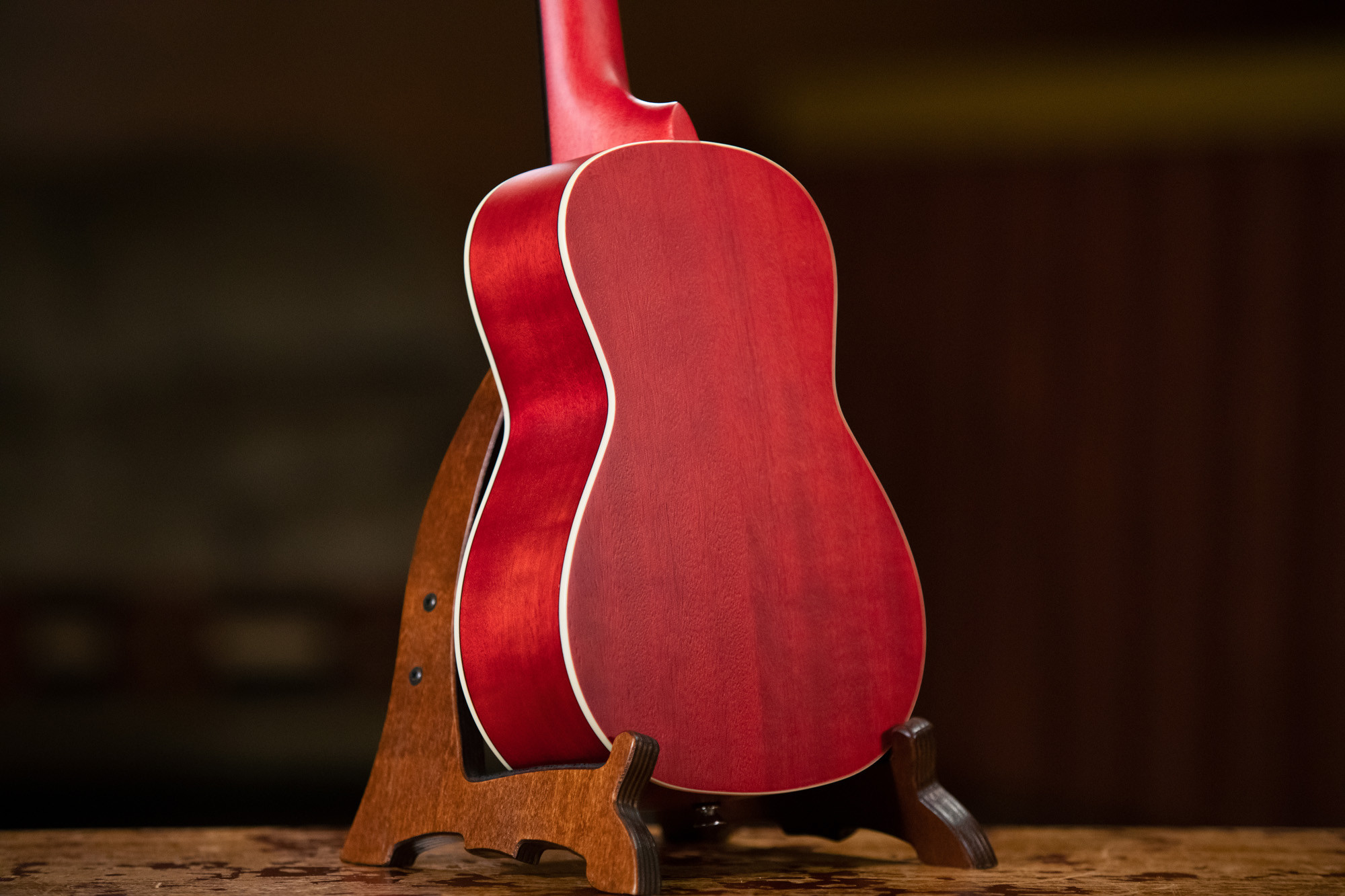Concert model, okoume top, okoume back and sides, mahogany neck, satin red finish.