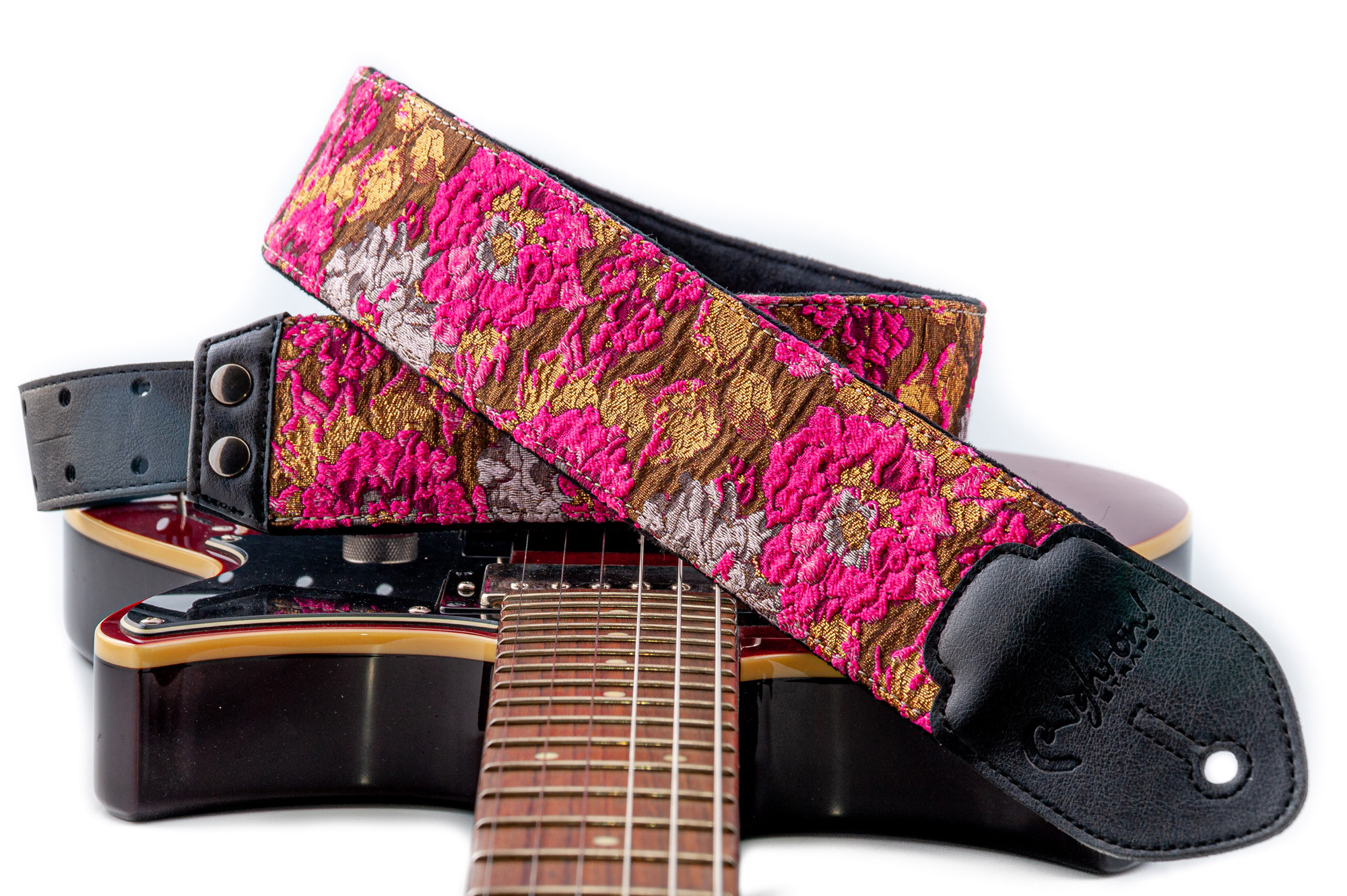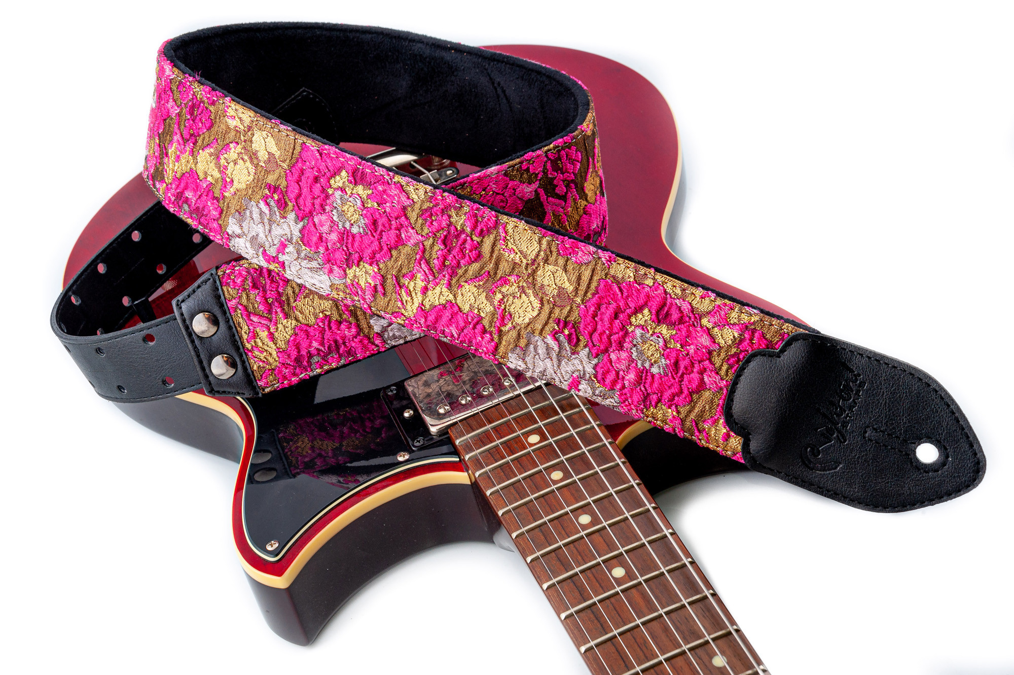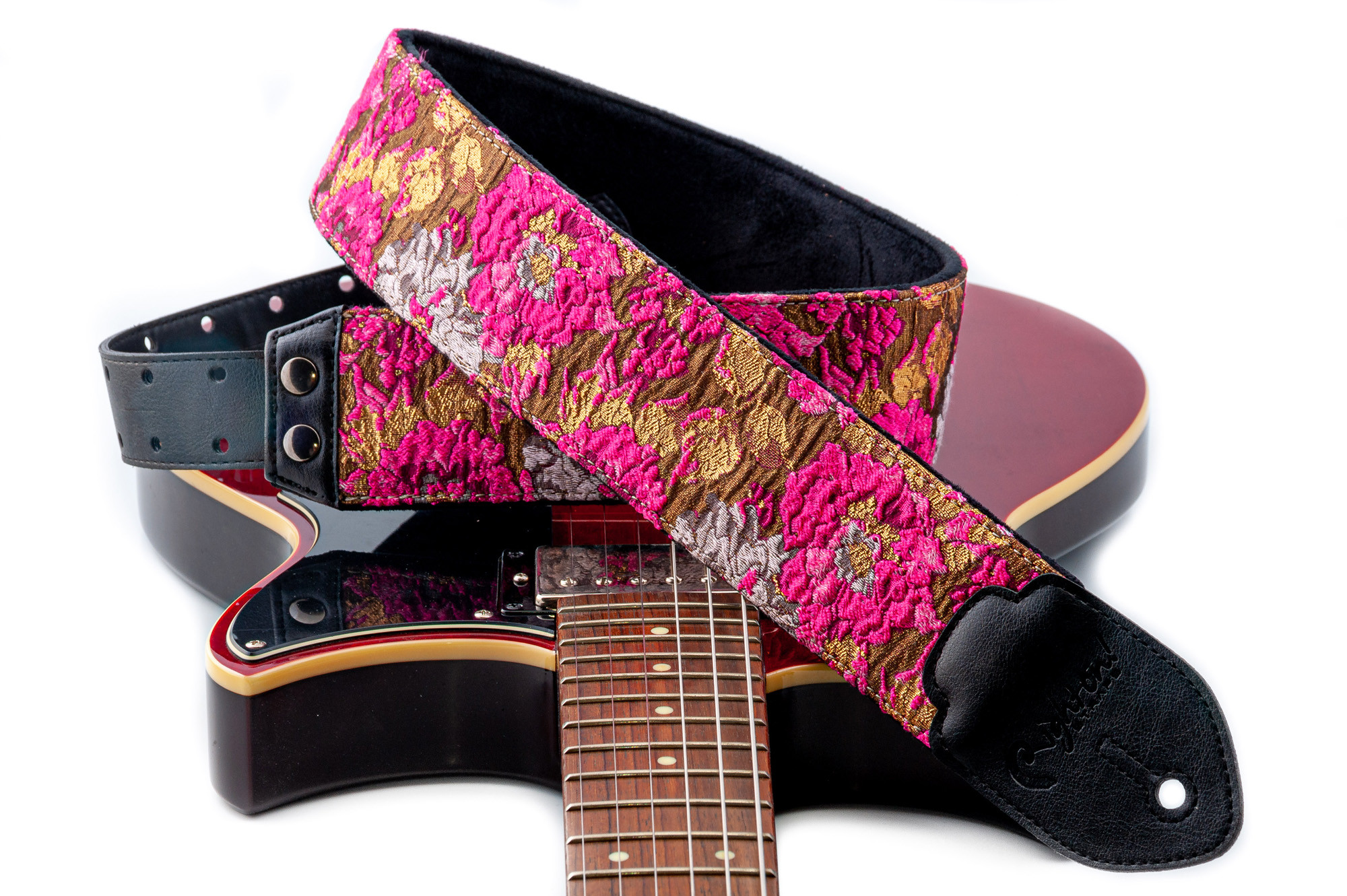 GOLD & ROSES limited edition model, designed with a synthetic and fabric exterior, a microfiber lining, high-quality leather ends, and high-density padding. Its 7 cm width and adjustable length from 95 to 150 cm provide comfortable wear. It also includes a pick holder and features a pink finish.