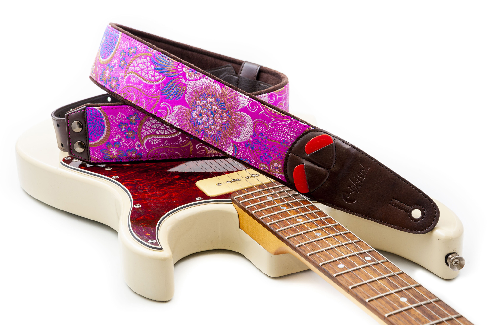 It is suitable for anyone looking for a comfortable, adjustable strap with an integrated pick holder and a pink finish.