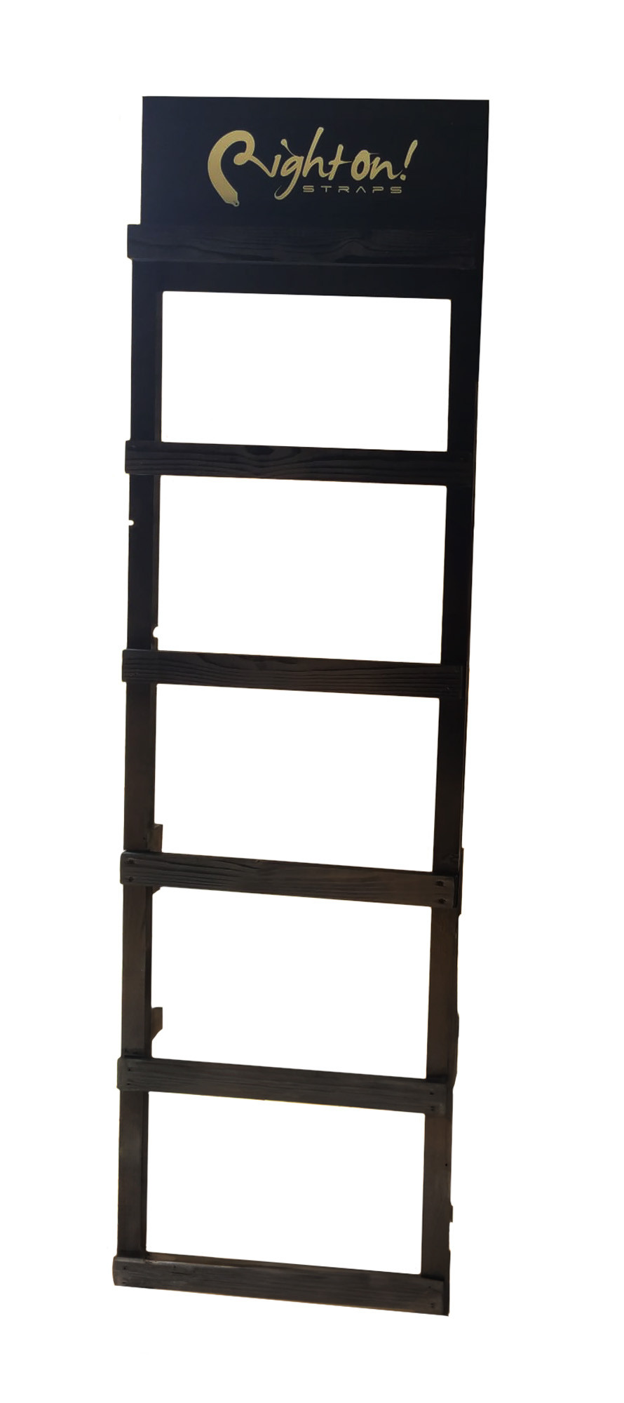 RightOn! Straps display stand, black wooden ladder model for 36 straps (6 tiers of 6 straps), dimensions 187 x 46 cm.