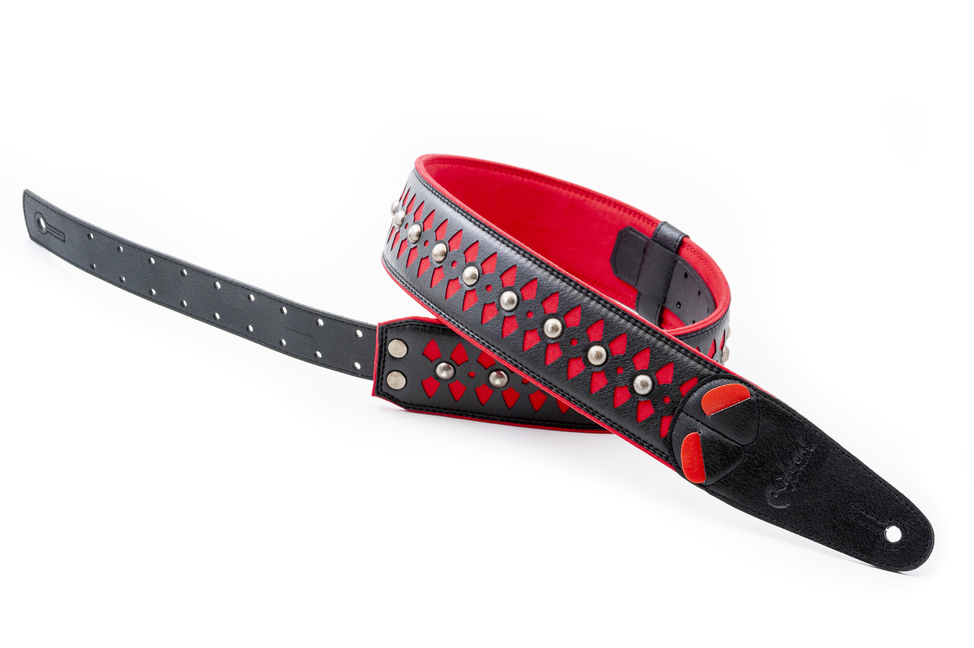This ARMOUR model strap combines a synthetic exterior with a microfiber lining and 100% synthetic ends. It features high-density padding for greater comfort, a width of 6 cm, and an adjustable length from 100 to 150 cm. Its integrated pick holder makes it a practical everyday accessory. Its red and black colorway gives it a bold style.