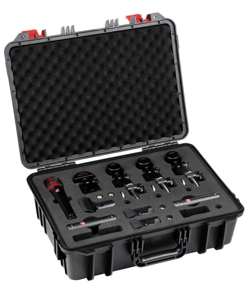 It is aimed at musicians and sound engineers who want to record a full drum kit with a microphone set designed for the bass drum, snare drum, toms, and cymbals or overheads.