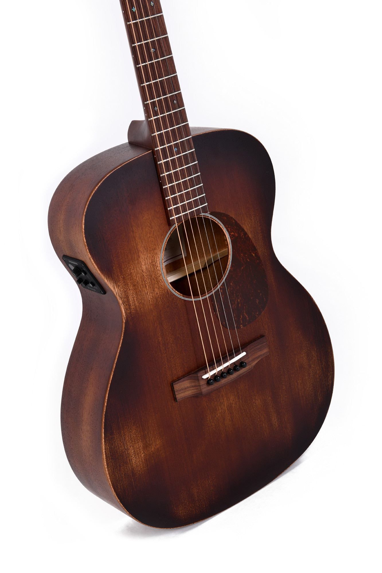 Model 000M-15E-AGED, 000 shape, solid mahogany top, mahogany back and sides, pau ferro fingerboard and bridge, with Fishman EQ, aged natural finish.