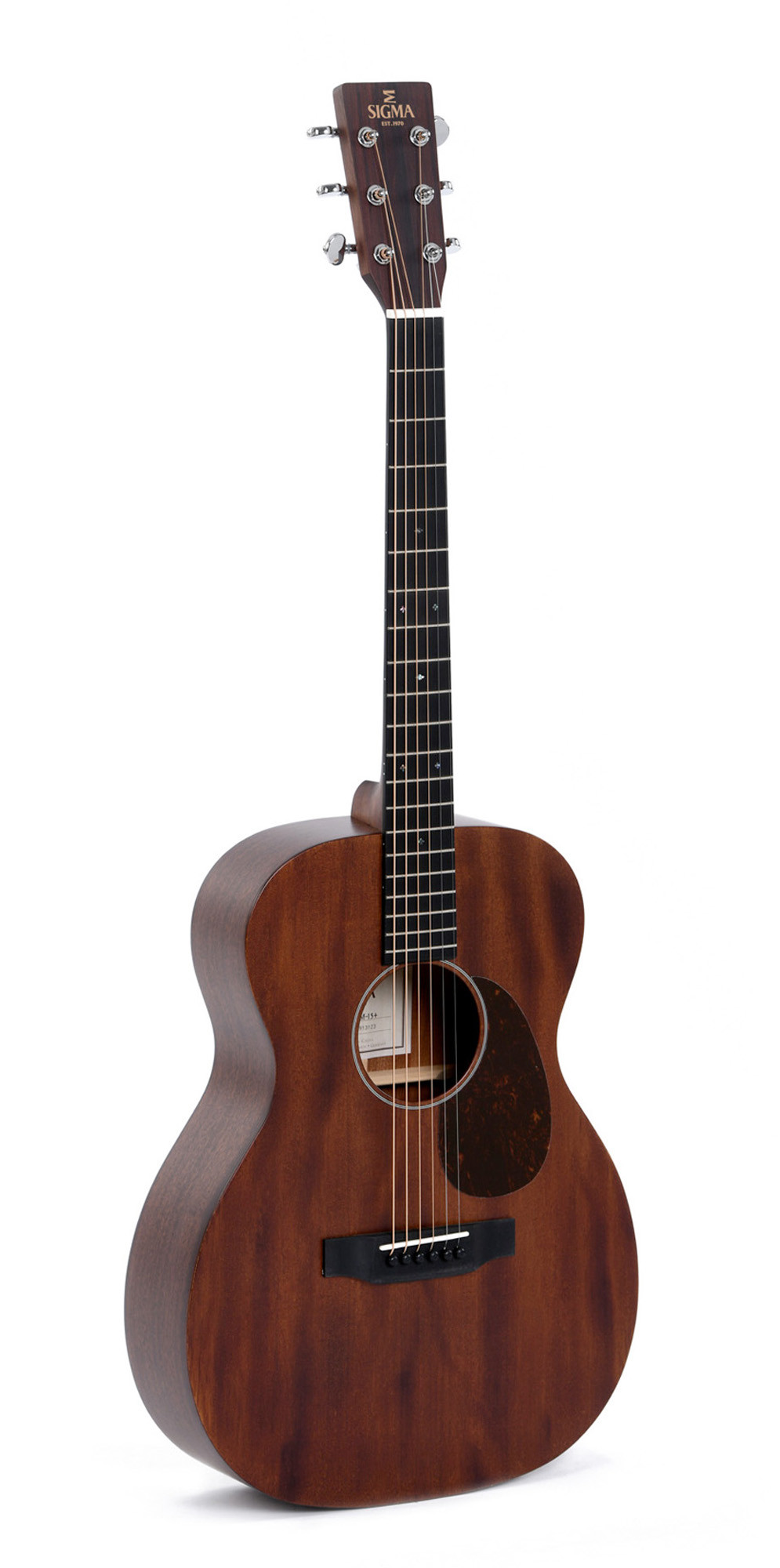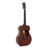 Model 00M-15, 00 body shape, with a solid mahogany top and a natural satin finish. This model combines mahogany back and sides, a mahogany neck, a micarta fingerboard, as well as bone nuts and saddles for a consistent, carefully made construction.